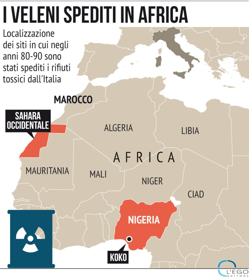 In Nigeria, a Koko, dove gli 007 italiani nel 1988 scoprono una discarica con 10 mila tonnellate di veleni, poi rimpatriati a spese dei contribuenti. O nell’ex Sahara spagnolo, scelto per la maxi discarica sotto la sabbia del famigerato progetto Urano («La madre di tutti i traffici» dice Anghessa). «Tutto era gestito da piduisti di chiara fama – spiega – ma oggi i traffici continuano. Tra Mauritania e Mali ho incrociato gli stessi personaggi di allora. Non credo fossero lì per turismo». Secondo molti indizi, alcuni carichi si 'persero' invece nel Mediterraneo. Il 6 dicembre ’95, come risulta da verbale, Anghessa consegna a De Grazia «una mappa nautica dell’Istituto idrografico della Marina rappresentante la Calabria e lo Ionio, con segnate le presenze di alcune navi in epoche ben precise tra cui la Euroriver, la Paloma e la Irini, facenti capo alla citata organizzazione e adibite a trasporto di armi, droga e rifiuti».