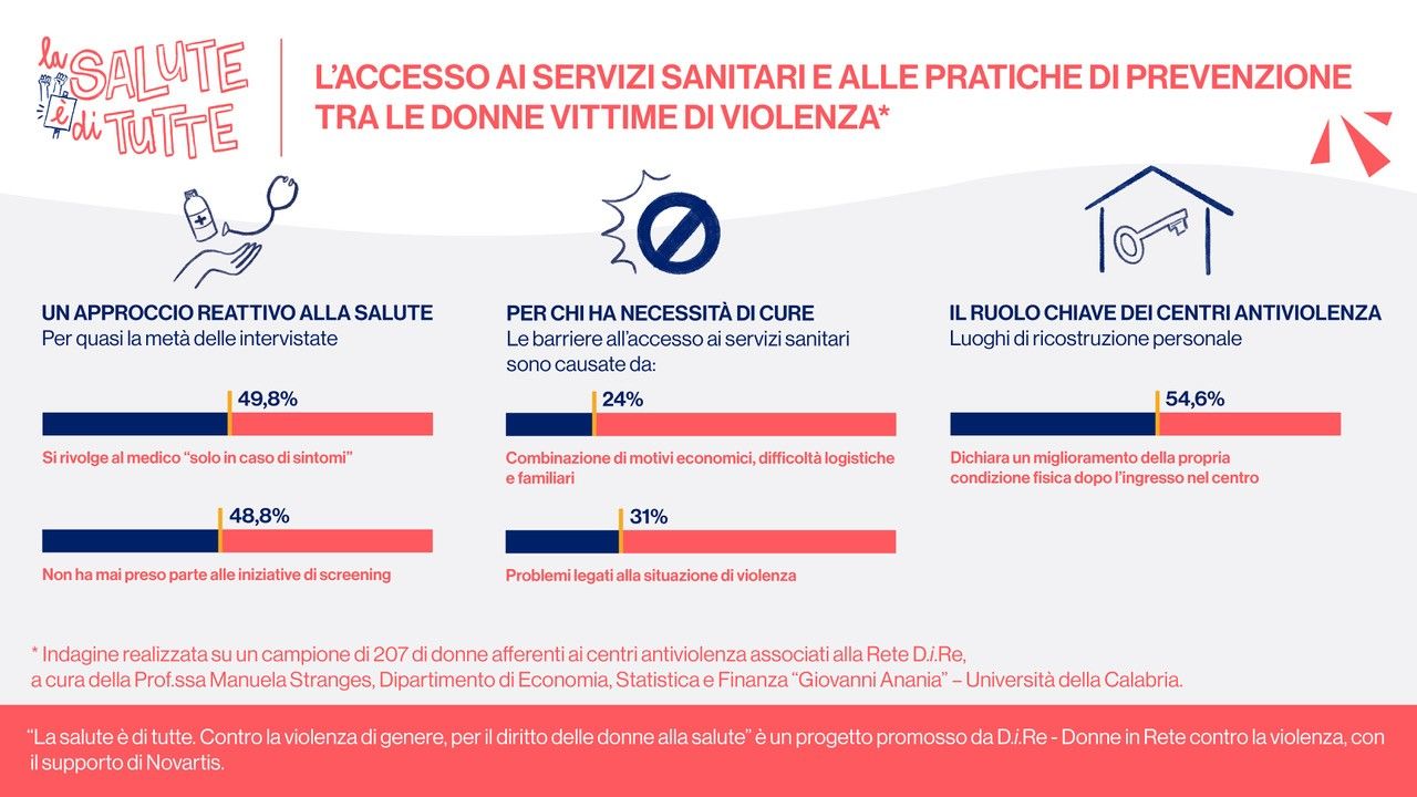 Nell’attesa che il sistema si metta in ascolto, intanto, per avvicinare le donne vittime di violenza ai percorsi di prevenzione e presa in carico, il progetto “La salute è di tutte” prevede anche degli appuntamenti nei centri antiviolenza di D.i.Re su tutto il territorio nazionale, con la possibilità per le donne di realizzare visite e colloqui dedicati alla salute senologica e cardiovascolare. «Come azienda che lavora alla frontiera dell’innovazione medico-scientifica, riteniamo importante impegnarci a favorire nuovi modelli di collaborazione a livello sanitario e sociale, per garantire la piena realizzazione del diritto alla salute secondo criteri di equità e di universalità», spiega invece Chiara Gnocchi, Country Head Comms. & Advocacy di Novartis Italia. Nell’ottica di contribuire alla costruzione di una maggiore equità, «è nata la volontà di sostenere D.i.Re in questo progetto che mette la salute al centro della rinascita dalla violenza e intraprende un percorso di superamento degli ostacoli che allontanano le donne dall’accesso alla prevenzione e ai servizi sanitari». L’augurio, dice infine Gnocchi, «è che questo primo passo possa contribuire a generare un cambiamento concreto».