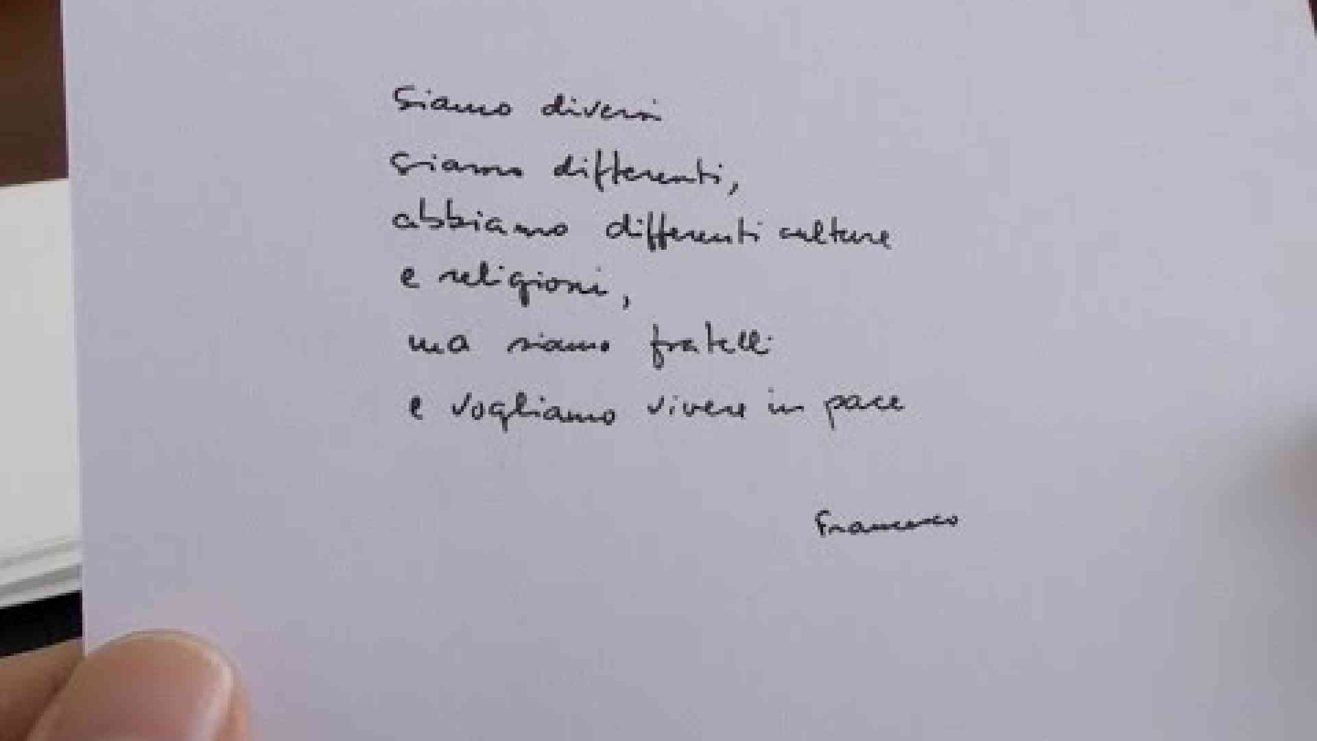 Nemmeno lui dimentica le parole di Francesco: «Il suo messaggio era anche per noi musulmani, Fare del bene alle altre religioni e vivere in pace, perché siamo tutti fratelli».E per ricordare quei momenti, la cooperativa Auxilium ha realizzato insieme all’editrice "Vivere In" il libro fotografico "Una carezza di Dio". Ed è la quarta di copertina a emozionare, con le parole autografe di papa Francesco, scritte proprio per questo volume. La cui introduzione è stata curata dall’arcivescovo Rino Fisichella, presidente del Pontificio Consiglio per la nuova evangelizzazione, che un anno fa accompagnò il Santo Padre fra i migranti del Centro di Castelnuovo.