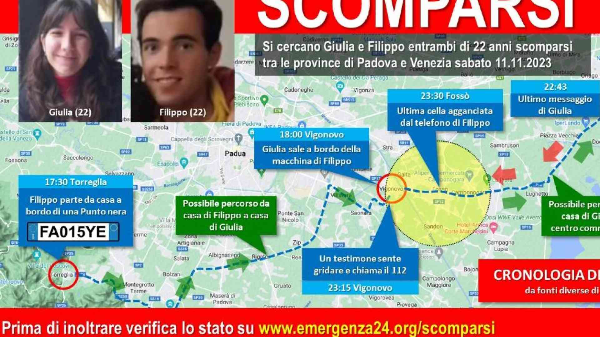 Continuano le ricerche dei due ragazzi spariti quattro giorni fa da Vigonovo, in provincia di Venezia. Si tratta di Giulia Cecchettin, del posto, e Filippo Turetta, abitante a Torreglia, nel Padovano, entrambi di 22 anni, ex fidanzati, studenti di Ingegneria all'università di Padova. Di loro non si hanno più notizie da sabato scorso. Un vicino di casa della famiglia di lei ha raccontato agli investigatori di aver visto alle 23.15 di sabato l’automobile del ragazzo, una Fiat Punto nera, parcheggiata a pochi metri dall’abitazione. La testimonianza è ritenuta attendibile. L’uomo dice di aver sentito delle grida, come di due persone che litigavano, e poi di aver notato qualcuno che spingeva con forza una donna all’interno della vettura.