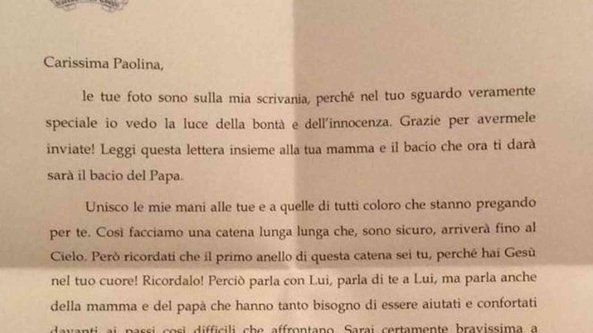"Carissima Paolina, le tue foto sono sulla mia scrivania, perché nel tuo sguardo veramente speciale io vedo la luce della bontà e dell'innocenza. Grazie per avermele inviate!". Inizia così una lettera indirizzata il 22 settembre da Papa Francesco a una bambina gravemente malata, resa nota nei giorni scorsi in occasione del suo funerale e rilanciata dal quotidiano online Il faro di Roma.
