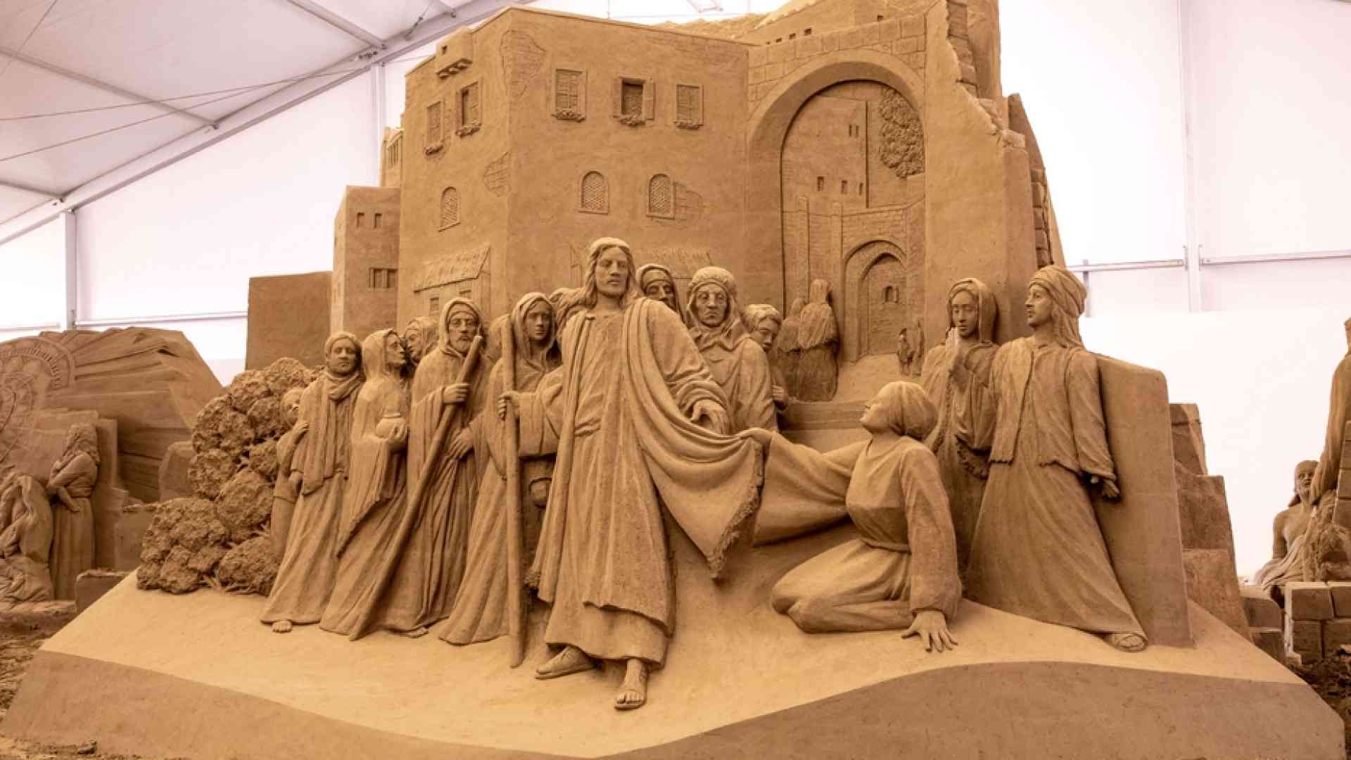 Monumentale, all’apparenza granitico, indistruttibile. In realtà costruito con il più effimero e impalpabile dei materiali, la sabbia. Anche quest’anno a Jesolo i più abili scultori di sabbia sono giunti da tutto il mondo per dare forma al "Sand Nativity 2021", dodici gigantesche composizioni dedicate al Natale e – in questa edizione particolare – ai miracoli di guarigione compiuti da Cristo: dal servo del centurione alla resurrezione di Lazzaro, dal lebbroso al sordomuto, dall’indemoniato al nato cieco... Dodici capolavori, che solo pochi giorni fa erano altrettanti ammassi informi di sabbia scaricati dai Tir nella centrale piazza Trieste. È lì che gli artisti, selezionati in Europa e in America dal direttore artistico, lo statunitense Richard Varano, hanno scolpito per giorni le mille tonnellate di sabbia dorata, la stessa che in estate rende tanto famoso il litorale adriatico.
