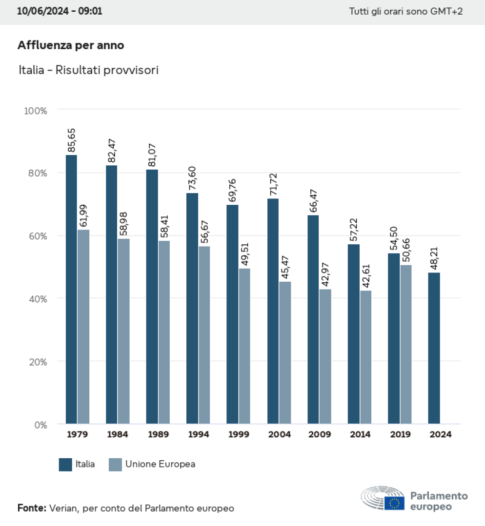 Si tratta di un record negativo a livello assoluto: le Europee del 2024 sono risultate le prime elezioni della storia della Repubblica in cui i votanti sono stati meno di uno su due. Un dato che colpisce anche alla luce del fatto che per questo voto sono scesi in campo direttamente molti leader di partito, che a quanto pare non hanno convinto gli elettori a recarsi alle urne.