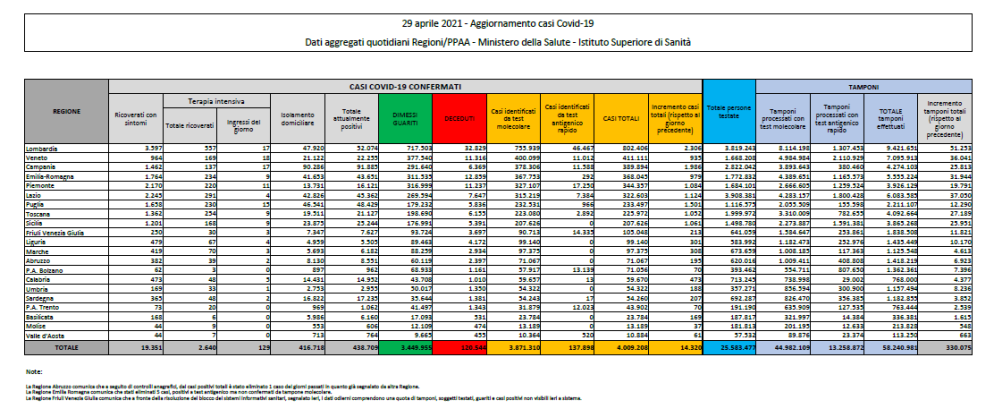 🔴 #Coronavirus, 29/04/21• Attualmente positivi: 438.709• Deceduti: 120.544 (+288)• Dimessi/Guariti: 3.449.955 (+18.088)• Ricoverati: 21.991 (-580)• di cui in Terapia Intensiva: 2.640 (-71)• Tamponi: 58.240.981 (+330.075)Totale casi: 4.009.208 (+14.320, +0,36%) pic.twitter.com/qCYvy2Om4Y— YouTrend (@you_trend) April 29, 2021