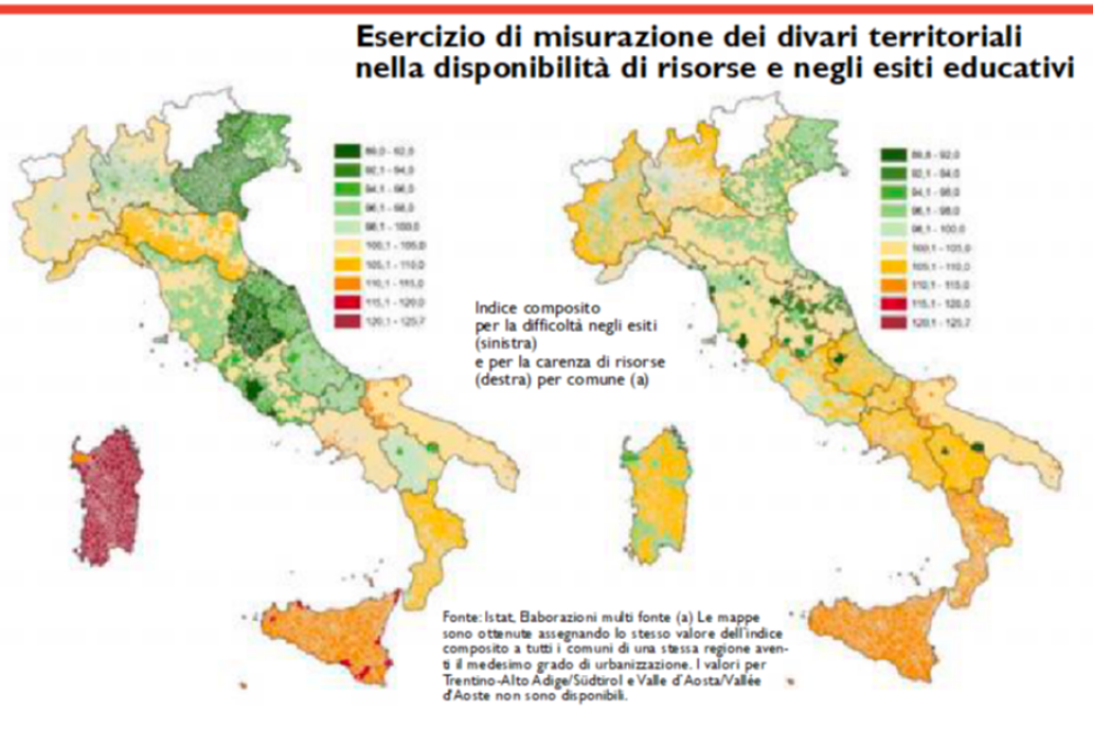 Ci sono di mezzo tutte le variabili possibili, da quelle economiche fino al contesto ambientale, all’alfabetizzazione o all’adeguatezza dei servizi educativi. Dalla combinazione di questi diversi indicatori l’Istat sta costruendo una griglia attraverso la quale leggere le microaree del Paese: la prima mappa è stata pubblicata poche settimane fa, a luglio alla Conferenza nazionale di Statistica verrà presentato lo step successivo. Ma intanto già sono emersi i primi risultati. Che vedono spiccare Umbria e Veneto per gli esisti scolastici, dove le carenze maggiori sono in Sardegna, Sicilia, Calabria e Liguria; cambia, invece, la distribuzione delle risorse: le aree periferiche risalgono, Sardegna in testa, scendono invece quelle più urbanizzate: Lombardia, Piemonte, Campania, Lazio. Sommando le due dimensioni, ecco che spicca il centro Italia: Abruzzo, Marche, Umbria.