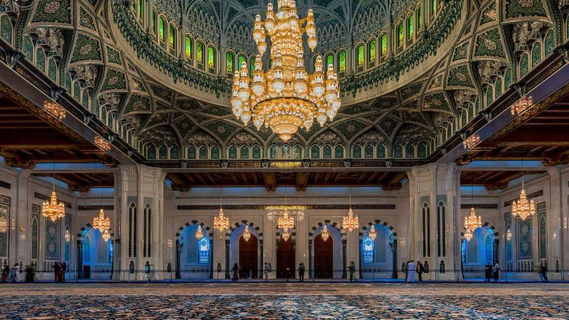 Meta obbligata per qualunque visitatore di passaggio nella città che ha dato il nome alla noce moscata, la moschea è visitabile solo in una ristretta fascia oraria al di fuori degli orari di preghiera, e impressiona fin dal primo passo al suo interno per la cura di ogni singolo dettaglio e per la pulizia dei suoi ambienti. I pavimenti lucidati a specchio e le geometrie perfette di ogni angolo da cui si osservi il maestoso edificio sono solo un breve assaggio di ciò che aspetta il visitatore, o il fedele, nella principale sala di preghiera. Al suo interno l’attenzione viene immediatamente catalizzata da un enorme lampadario di cristallo che pende al centro dalla sala, alto 14 metri, come un condominio di 3 piani. A uno sguardo attento, inoltre, si nota che l’enorme tappeto su cui si poggiano i piedi non sembra avere interruzioni, ed è infatti un pezzo unico composto da oltre un miliardo e 700 milioni di nodi, realizzato a mano nell’arco di 4 anni. Per qualche anno è stato il tappeto più grande mai realizzato dall’uomo, superato solo qualche anno dopo da quello costruito per la sontuosa moschea di Abu Dhabi.