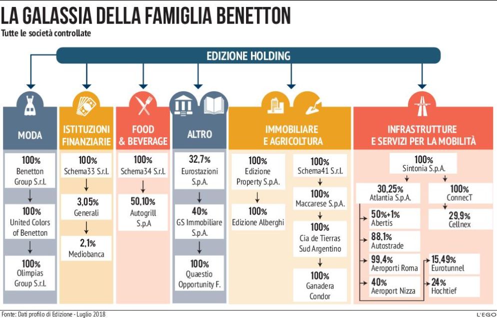 Se si guarda al tesoro di Edizione si scopre che la metà è rappresentata dai 6,7 miliardi della quota in Atlantia, 1,5 miliardi è il valore dell’immobiliare, 1,4 miliardi quello di Autogrill, 618 milioni il retail ex Benetton e 588 milioni sono gli investimenti finanziari tra cui il 3% in Assicurazioni Generali e il 2,1% in Mediobanca.