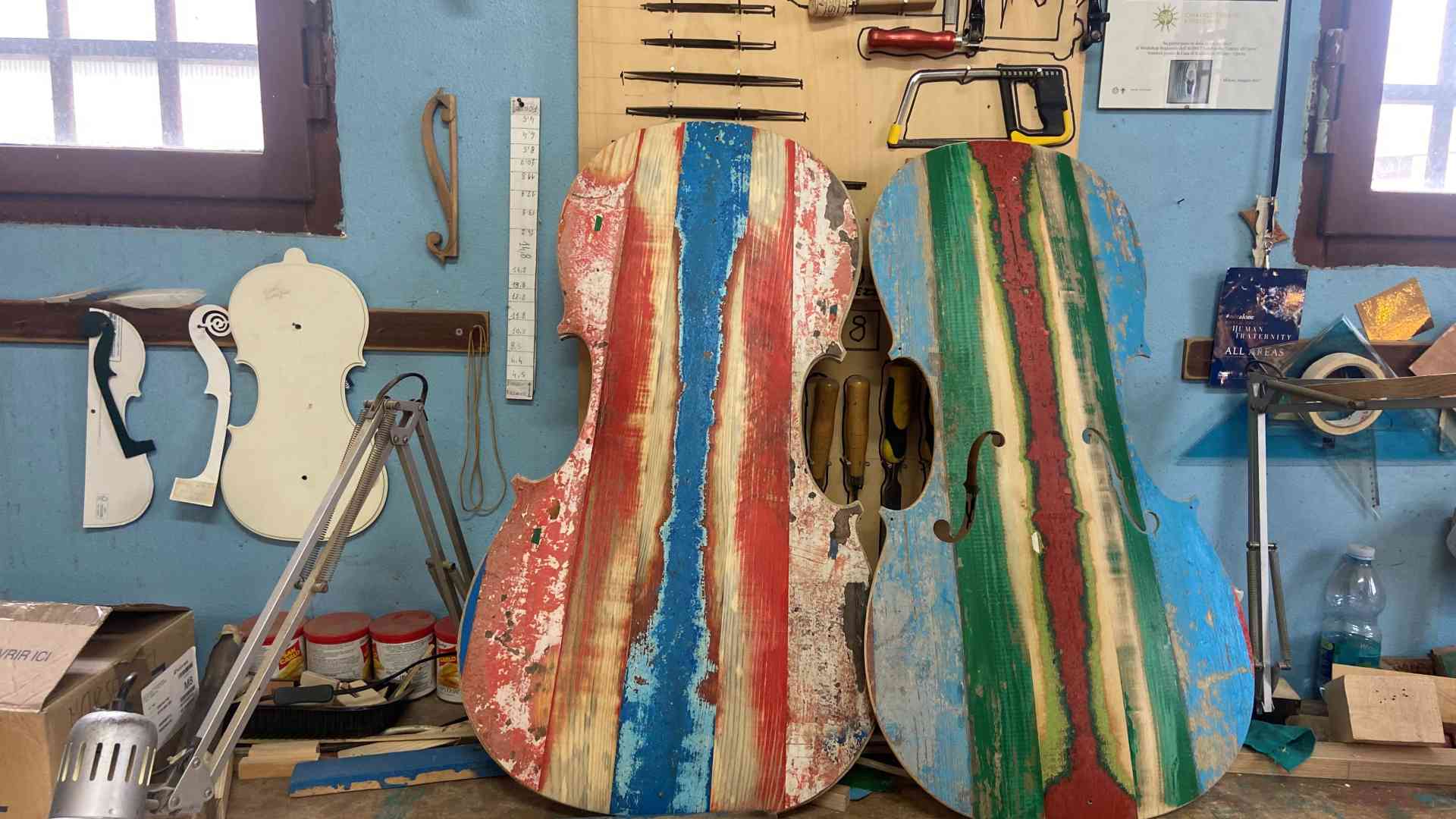 Metamorfosi, appunto. «Si tratta soprattutto di legni di conifere, che usiamo per il fasciame degli strumenti», spiega Enrico Allorto, che con Carlo Chiesa è il maestro liutaio, «mentre per lo scheletro utilizziamo un altro legno più duro di cui non conosco il nome. Sono alberi africani oppure, chissà, di importazione, non sappiamo quelle barche da dove arrivassero. Ovviamente non hanno la resa dei veri legni di liuteria, ma cerco i pezzi più adatti: i più leggeri per simulare l’abete rosso e i più pesanti per imitare l’acero di cui è fatto il fondo. È chiaro che sono legni difficili, hanno addosso la vernice delle barche, le crepe, i buchi: mentre costruiamo gli strumenti ripariamo i danni, ma c’è una sofferenza in questi difetti e il fatto che riescano comunque a suonare scuote emotivamente. Da quei violini esce un Sos, “non lasciateci morire”, anche i musicisti suonando si commuovono».