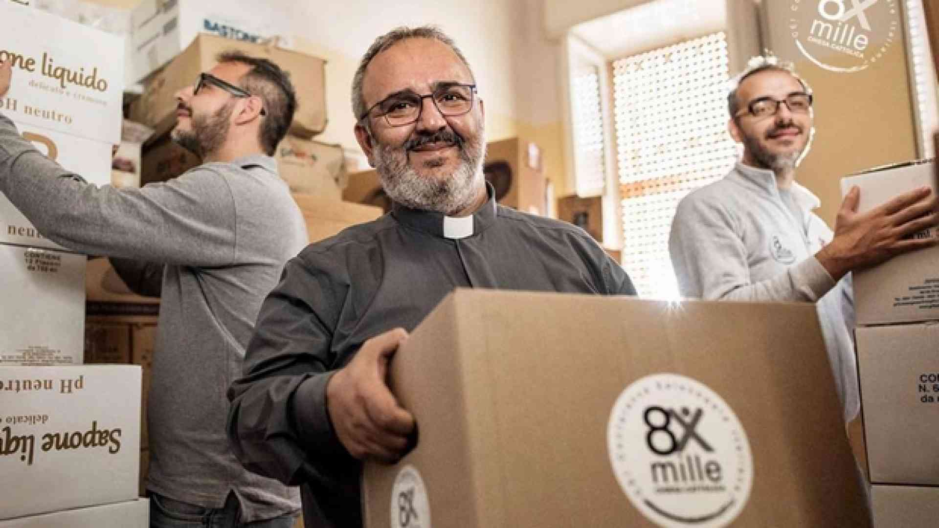 Il direttore della Caritas diocesana di Siracusa in un momento della distribuzione dei pacchi viveri alle famiglie in difficoltà