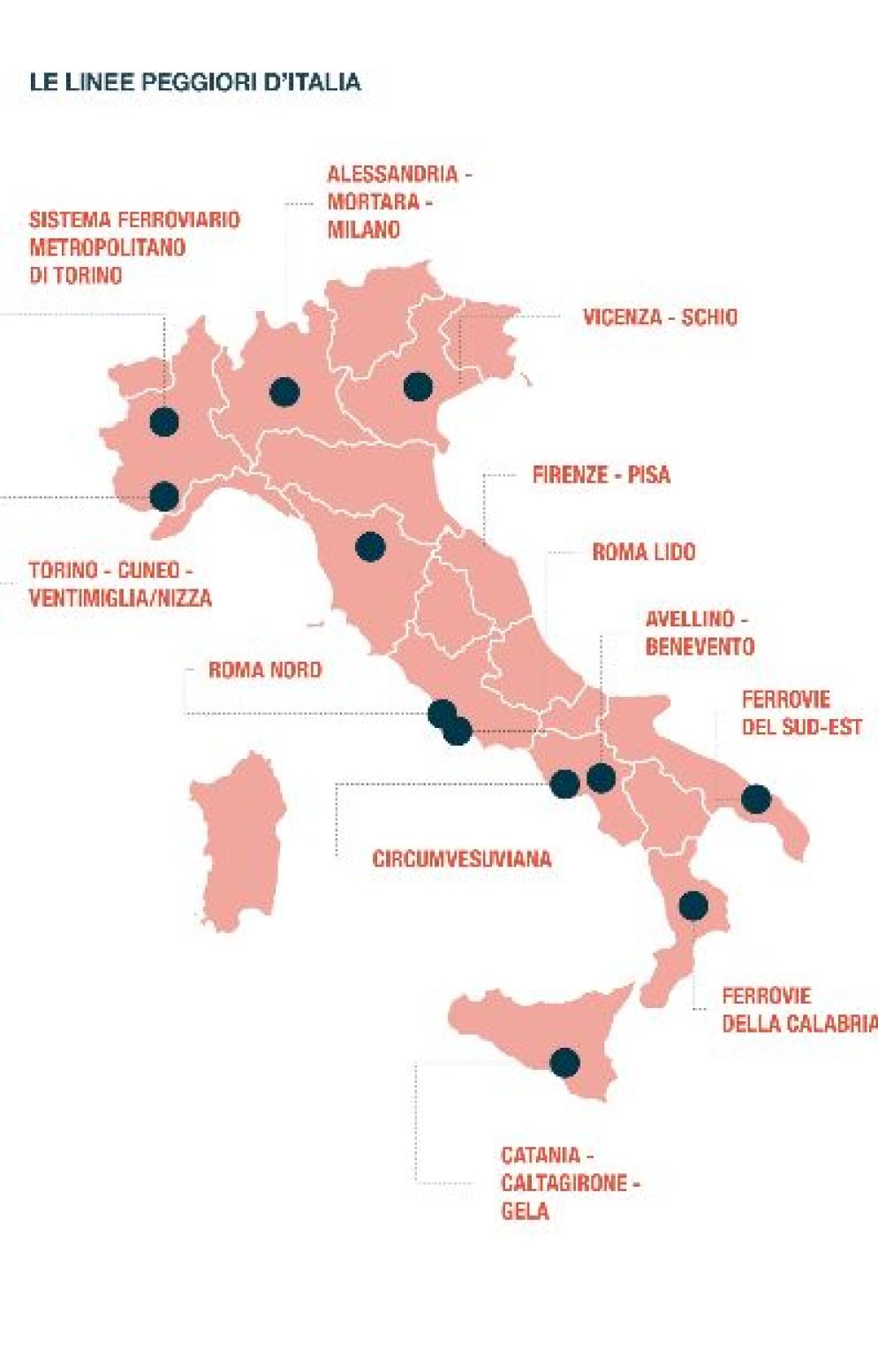 I disagi maggiori si registrano sulle linee ex Circumvesuviane, segnate da avarie, soppressioni, tagli, sovraffollamenti. Tra i viaggiatori che hanno dovuto affrontare sfide quotidiane ci sono poi quelli della Roma Nord-Viterbo, che nel 2024 ha visto oltre 5.000 corse soppresse. Problemi simili anche sulla Milano-Mortara-Alessandria, che serve 19.000 persone al giorno ed è caratterizzata da guasti frequenti e ritardi, e sulla Catania-Caltagirone-Gela di cui una tratta, la Caltagirone-Niscemi-Gela, è sospesa da ben 13 anni e mezzo. Per la Roma-Lido si vede un leggero miglioramento, ma sono ancora molti i problemi dei pendolari su questa linea.