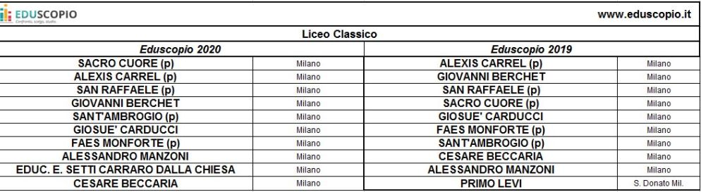 A Milano, sono tutti paritari i primi tre licei classici. Si tratta del “Sacro Cuore”, piazzatosi sul gradino più alto del podio, seguito dall’“Alexis Carrell” e dal “San Raffaele”. Il “Civico Manzoni”, anch’esso non statale è, invece, il primo liceo linguistico e ancora un non statale è al primo posto tra i licei artistici della metropoli: si tratta del “Sacro Cuore”, con al terzo posto le “Orsoline di San Carlo”, mentre il paritario “Preziosissimo Sangue” è il miglior liceo artistico di Monza e Brianza.