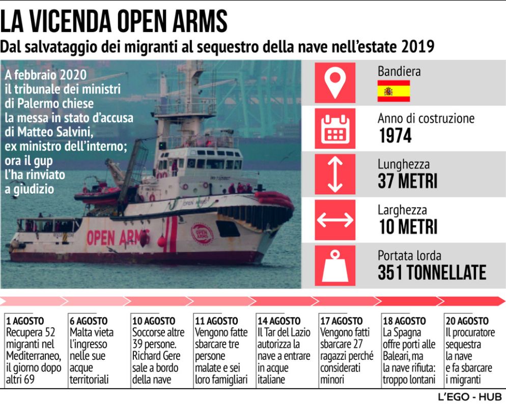 Il gup di Palermo Lorenzo Jannelli ha rinviato a giudizio il leader della Lega Matteo Salvini. Il senatore del Carroccio risponde di sequestro di persona e rifiuto di atti d'ufficio per avere impedito, secondo la Procura illegittimamente, alla nave della ong catalana Open Arms, con 147 migranti soccorsi in mare, di attraccare a Lampedusa. Per giorni i profughi rimasero davanti alle coste dell'isola. La vicenda si svolse a partire dall'agosto 2019, quando Salvini era ministro dell'Interno del primo governo Conte.
