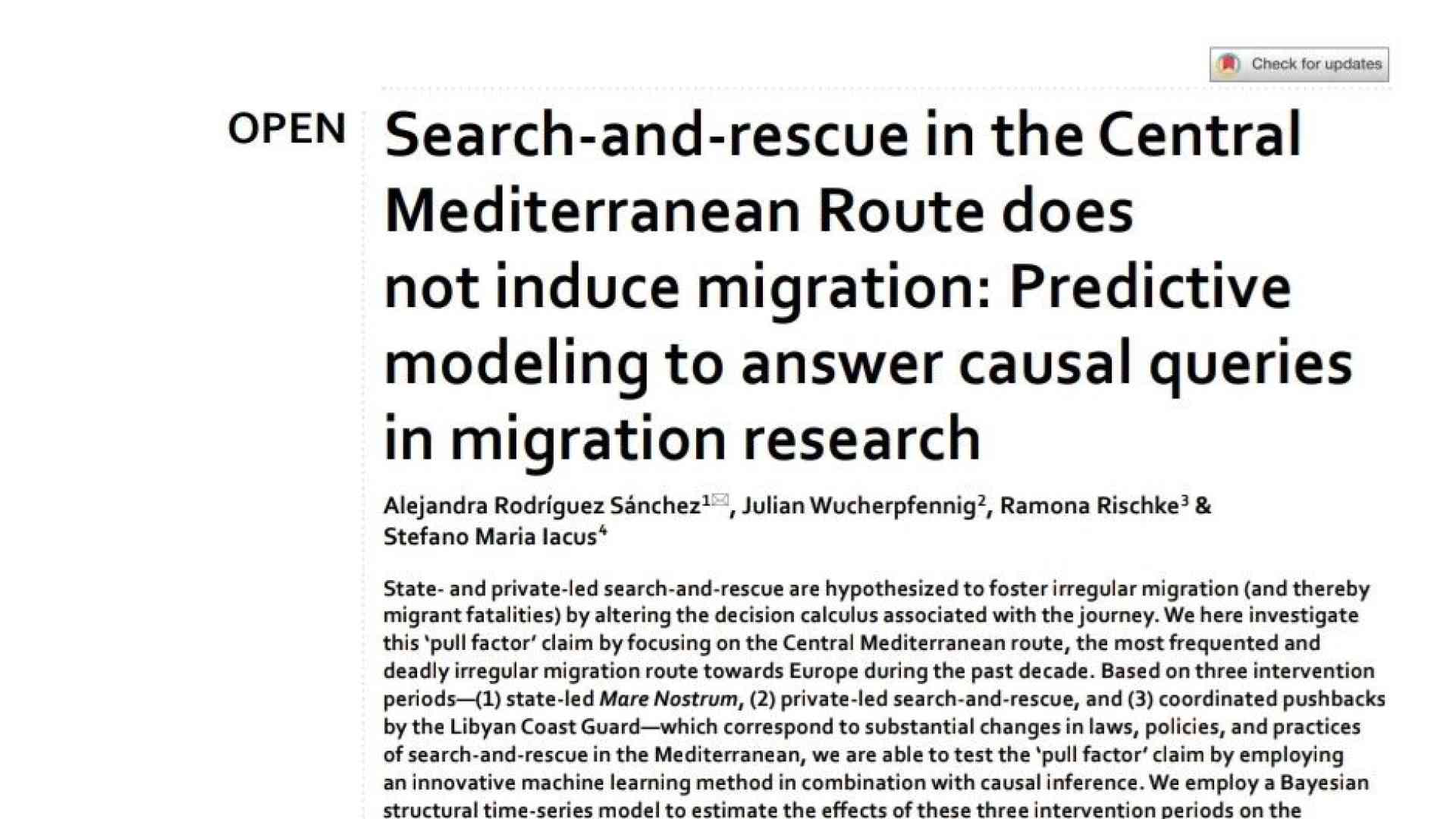 Per gli autori dello studio approvato da Nature, è stato riscontrato come la presenza di soccorritori in mare “non incentiva ulteriori tentativi di attraversamento. Tuttavia, il numero di attraversamenti di frontiera sembra essere guidato da alcuni cambiamenti nell'intensità dei conflitti, nei prezzi dei prodotti di base e delle materie prime e dei disastri naturali, nonché dalle condizioni meteorologiche, dagli scambi valutari e dal traffico aereo tra Nord Africa e Medio Oriente e l'Unione Europea”.