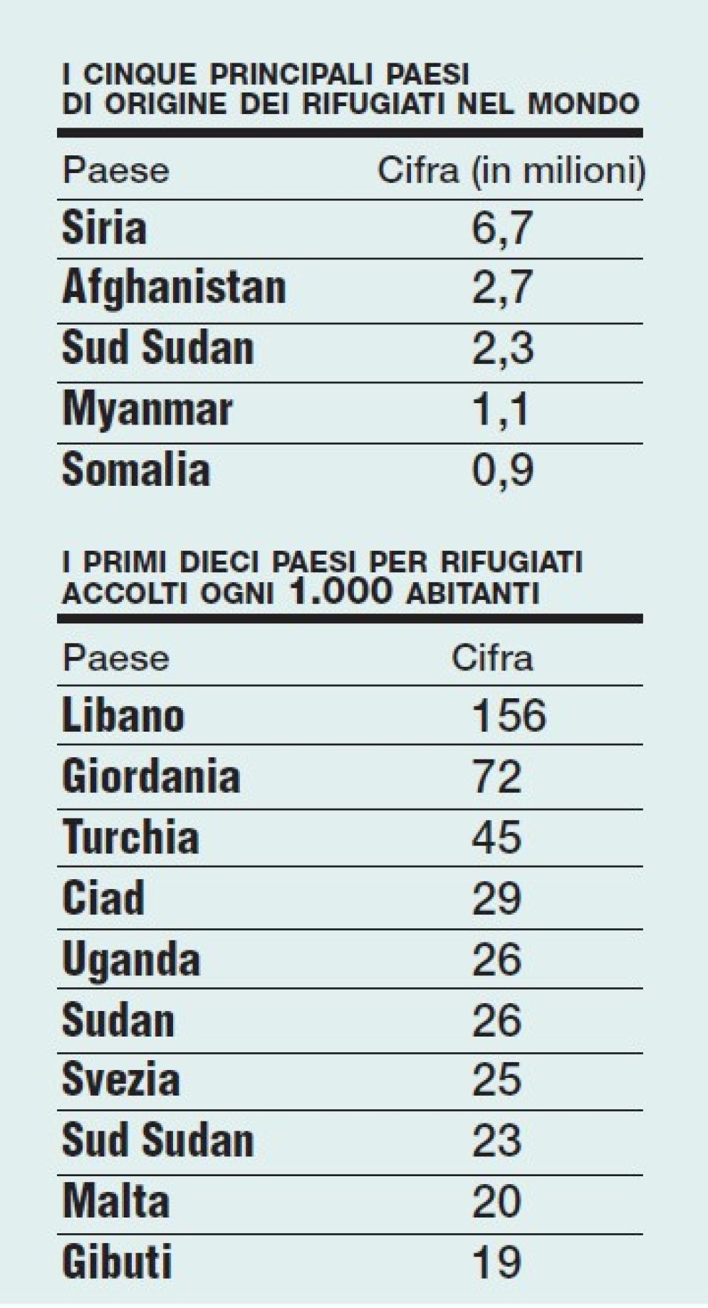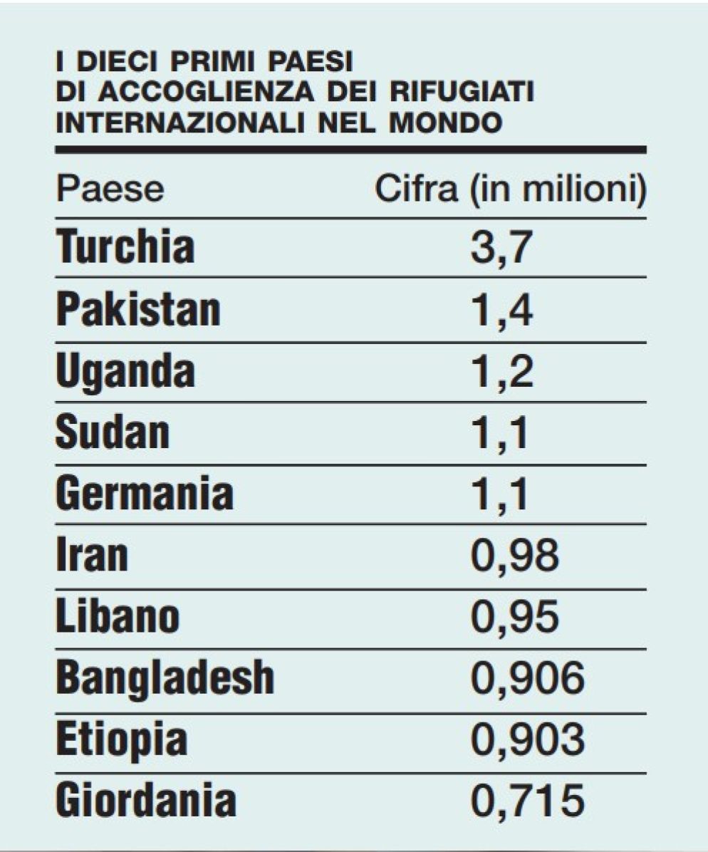 Sono 70,8 milioni, il numero più alto da 70 anni. Erano la metà 20 anni fa. L'80% scappa nei paesi confinanti. In Italia 3 ogni mille residenti, a Malta 20, in Svezia 25, in Turchia 72, in Libano 156