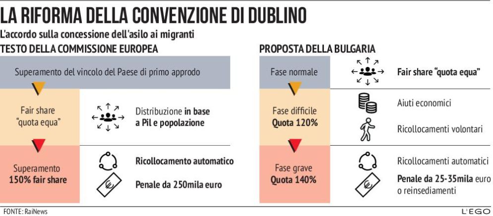 Il testo si mediazione bulgaro, che di fatto riduce la solidarietà nei confronti dei Paesi più esposti, contiene ancora le quote obbligatorie di ripartizione di richiedenti asilo tra gli Stati membri, ma solo in casi estremi, di "crisi grave", con soglie molto alte in termini di numero di arrivi e sulla base di una decisione che deve essere presa all'unanimità dai capi di Stato e di governo dell'Ue. Per contro, questo testo prevede maggiori responsabilità per i Paesi di primo ingresso, in particolare sul numero di anni (10) durante i quali hanno l'obbligo di riprendersi i richiedenti asilo che si trasferiscono in un altro Stato membro. Non solo:riduce da 250mila a soli 30mila euro le penale per gli Stati che si rifiutino di accogliere un richiedente asilo da altri Paesi. Di qui l'opposizione dei Paesi del Mediterraneo (Italia, Spagna, Grecia, Cipro e Malta), il cui fronte è rimasto compatto durante le trattative delle ultime settimane.