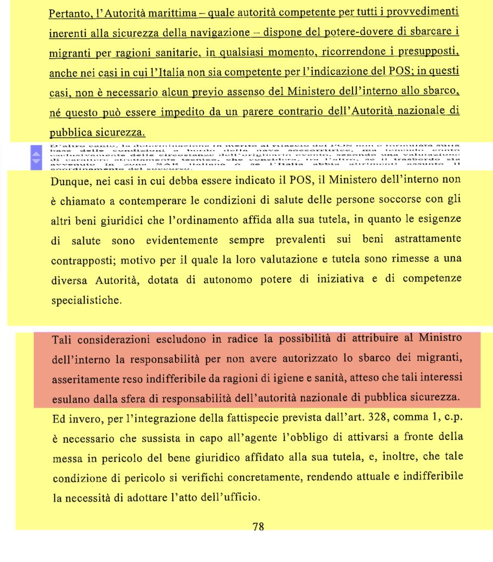 A pagina 78 viene esclusa «in radice la possibilità di attribuire al Ministro dell’Interno la responsabilità per non avere autorizzato lo sbarco dei migranti». Perché le norme individuano «l’autorità responsabile dell’esecuzione della convenzione Sar (sulla ricerca e il soccorso in mare, ndr) nel Ministro dei Trasporti e della navigazione e indica il Comando generale del Corpo delle Capitanerie di porto quale organismo nazionale che assicura il coordinamento generale dei servizi di soccorso marittimo».