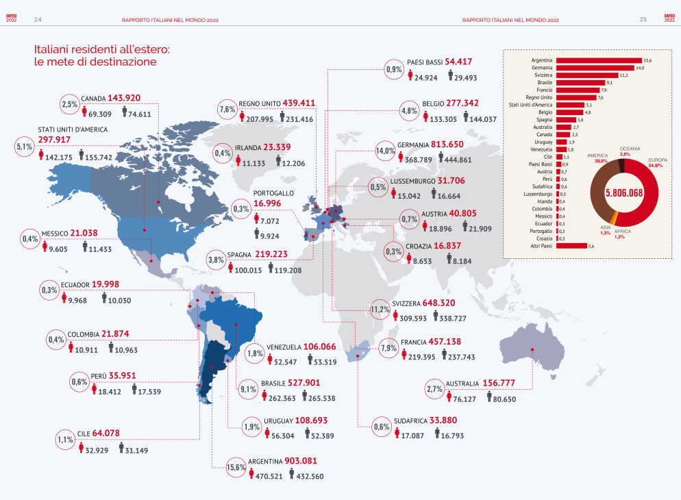In generale il 54,9%, quasi 3,2 milioni, vive in Europa, il 40% (oltre 2,3 mi­lioni) in America, centro-meridionale soprattutto (più di 1,8 milioni). Le comunità italiane all’estero più numerose sono, ad oggi, quella argentina (903mila italiani), tedesca (813.650), la svizzera (648.320), la brasiliana (527.900) e la francese (457.138). La Lombardia, con un quinto del totale, e il Veneto (l’11,7%) continuano ad essere, come da ormai diversi anni, le regioni da cui si parte di più. Seguono Sicilia (9,3%), Emilia-Romagna (8,3%) e la Campania (7,1%). Tuttavia, dei quasi 16 mila lombardi, dei circa 10 mila veneti o dei 7 mila emiliano-romagnoli molti sono, in realtà, protagonisti di un secondo percorso migratorio che li ha portati dapprima dal sud al settentrione e poi oltreconfine.