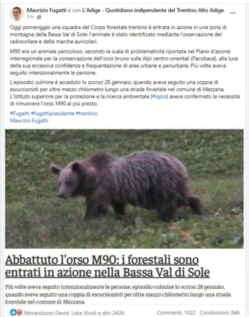 L'orso M90, un giovane esemplare di due anni e mezzo, è stato prelevato e ucciso dopo che domenica 28 gennaio aveva seguito una coppia lungo un sentiero nei boschi di Mezzana, in val di Sole, avvicinandosi fino a una decina di metri dai due escursionisti prima di allontanarsi. La decisione di abbatterlo è giunta a poche ore dal decreto firmato dal presidente della Provincia di Trento, Maurizio Fugatti, che ha incaricato il Corpo forestale di identificare l'animale e porre fine alla sua vita.