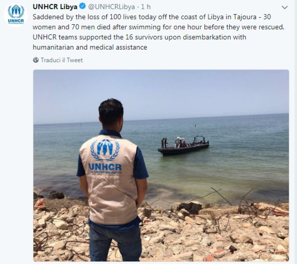 Hanno atteso in acqua un'ora, nuotando come potevano, aspettando soccorsi che non sono arrivati. Sono morte così 100 persone, 70 uomini e 30 donne, in un naufragio confermato dalla Guardia costiera libica e dall'Alto commissariato dell'Onu per i rifugiati (Acnur), che in un tweet si dice rattristato dalla tragedia.