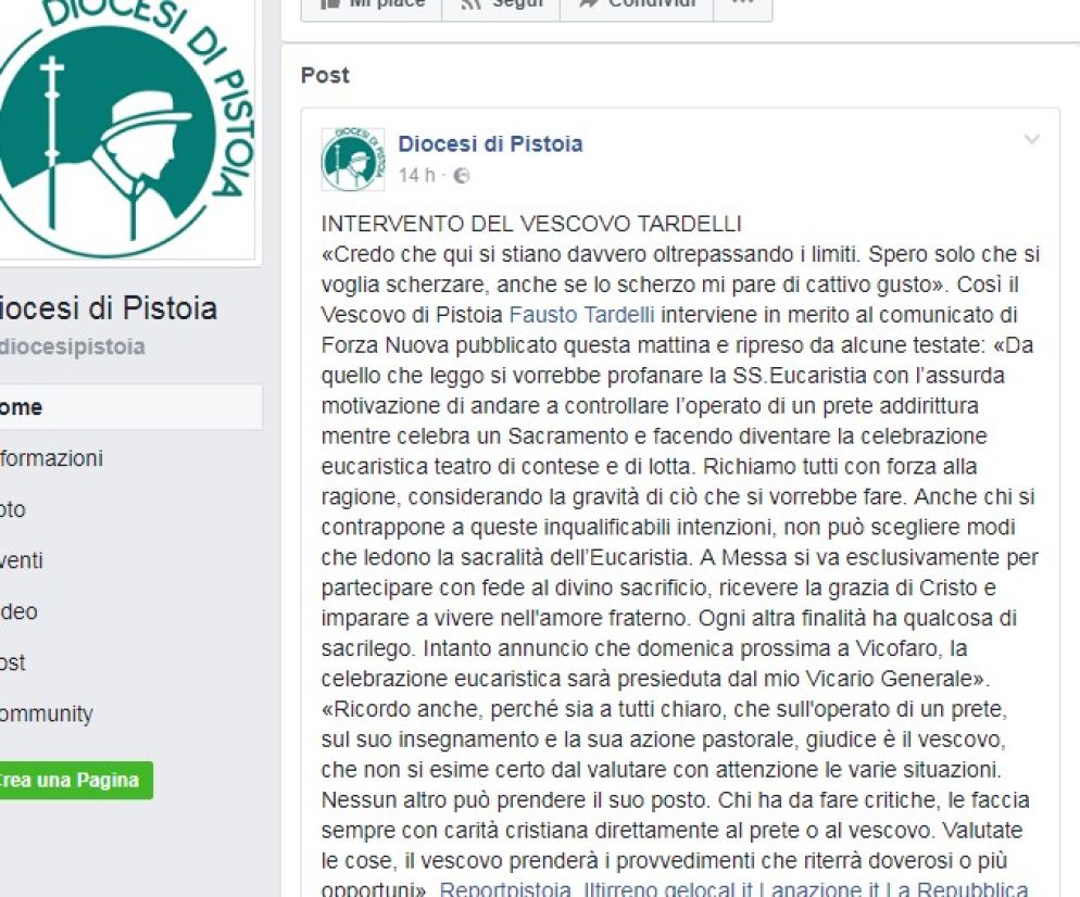 Di fronte all’avvertimento di Forza Nuova, il vescovo Tardelli non poteva non prendere le distanze. E l’ha fatto con i toni che deve usare un presule quando qualcuno si arroga la pretesa di prendere il suo posto: «Credo che qui si stiano davvero oltrepassando i limiti. Spero solo che si voglia scherzare, anche se lo scherzo mi pare di cattivo gusto», ha affermato in un comunicato. «Da quello che leggo si vorrebbe profanare la SS.Eucaristia con l’assurda motivazione di andare a controllare l’operato di un prete addirittura mentre celebra un Sacramento e facendo diventare la celebrazione eucaristica teatro di contese e di lotta. Richiamo tutti con forza alla ragione, considerando la gravità di ciò che si vorrebbe fare. Anche chi si contrappone a queste inqualificabili intenzioni, non può scegliere modi che ledono la sacralità dell’Eucaristia. A Messa – ha concluso Tardelli – si va esclusivamente per partecipare con fede al divino sacrificio, ricevere la grazia di Cristo e imparare a vivere nell’amore fraterno. Ogni altra finalità ha qualcosa di sacrilego».