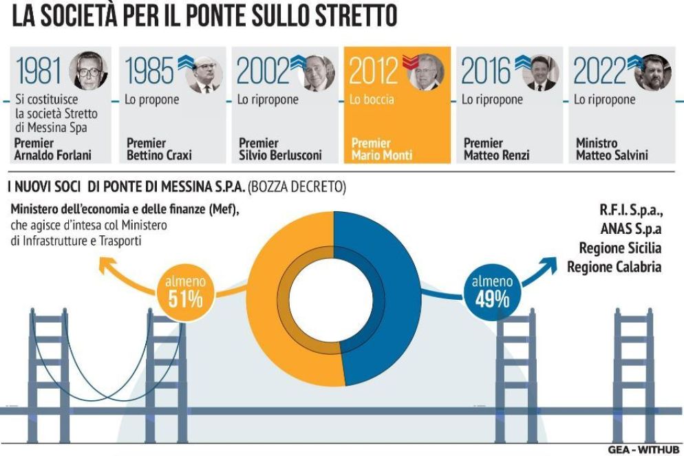 A mostrare per primo il plastico è stato il ministro dei Trasporti Matteo Salvini, che lo scorso 16 marzo lo ha svelato in piazza di Porta Pia alla presenza dei presidenti di Sicilia e Calabria, Renato Schifani e Roberto Occhiuto. Il modello finanziario ideato è lo stesso che il premier Monti bocciò nel 2012: recuperare la società Ponte di Messina Spa, con il ministero dell'Economia e delle finanze in qualità di azionista di maggioranza, aiutato dalla partecipazione di Rfi, Anas, Regione Sicilia e Regione Calabria. Struttura, in realtà, già messa in piedi dal governo Forlani nel 1981 e riproposta in seguito dagli esecutivi Craxi, Berlusconi e Renzi. Alla società, guidata e orientata dal Mef, spetterebbe l'arduo compito di costruire il ponte sospeso strallato più lungo del mondo: una campata centrale lunga 3.300 metri, un impalcato largo 60,4 metri, torri alte 399 metri, 65 metri di altezza del canale navigabile e 6 corsie stradali. Non solo. L'opera dovrebbe resistere a venti fino a 270 km/h e sopportare terremoti di magnitudo 7 sulla scala Richter.