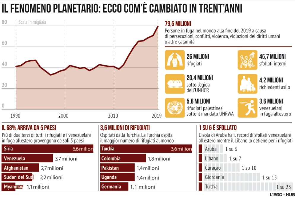 È al tredicesimo posto per popolazione. Ma è tra le “nazioni” più giovani e povere di mezzi e diritti. Solo lo scorso anno si sono aggiunte quasi 10 milioni di persone. La maggior parte di loro non ha un tetto né mezzi per vivere. È la “nazione dei profughi”: 79,5 milioni di persone, più di quanti la storia delle Nazioni Unite ne abbia mai conosciuti. Il doppio di quanti se ne contavano nel 2010. Soprattutto è una nazione errante fatta di bambini, fino a 34 milioni, più degli abitanti di Australia, Danimarca e Mongolia messe insieme. A volerli mettere in fila indiana si coprirebbe per due volte la circonferenza del nostro pianeta. Viene pubblicato oggi il rapporto annuale dell’Alto commissariato Onu per i rifugiati, alla vigilia della Giornata mondiale dei Rifugiati. Non concede una sola pagina di tregua. Alla fine del 2019 risultava essere in fuga dalle proprie terre la cifra senza precedenti di 79,5 milioni di persone. Un anno prima, era il 2018, si era già toccata la cifra record di 70 milioni. Sono gli effetti della “terza guerra mondiale a pezzi” tante volte denunciata da papa Francesco.