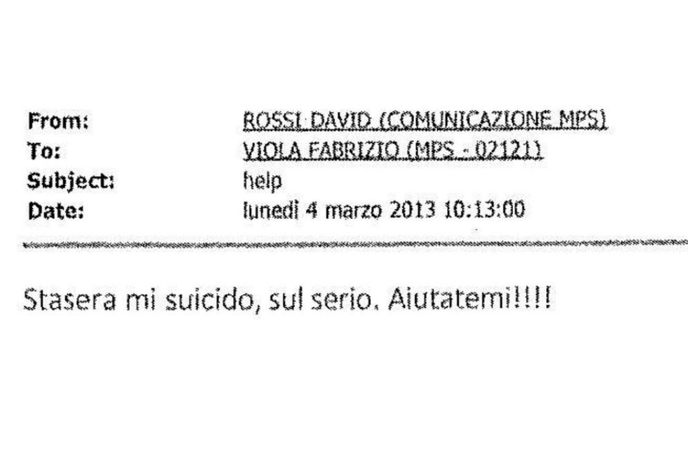 Uno dei punti più oscuri, reso noto negli ultimi giorni, riguarda la circostanza denunciata in una relazione della polizia postale, inclusa da tempo nella mole di allegati alla richiesta di archiviazione della procura di Genova: la mail con cui Rossi avrebbe annunciato l’intenzione di suicidarsi all’allora ad della banca, Fabrizio Viola, sarebbe stata in realtà creata il giorno successivo alla sua morte. Il messaggio è «Stasera mi suicido, sul serio. Aiutatemi!!!» e la polizia ha rinvenuto due versioni di questa mail, con la stessa frase, «ma entrambe hanno data di creazione il 7 marzo 2013» alle ore 11.41, mentre «il delivery time», ossia la presunta data di consegna «è del 4 marzo 2013 alle ore 10.13». Ora l’avvocato Miceli sollecita ulteriori accertamenti: «Riteniamo grave che l’incongruenza sulla mail non sia stata finora approfondita, dato che è un elemento fondante della tesi del suicidio. La Postale, in possesso del solo file copia, ha segnalato l’opportunità di approfondire, ma accertamenti non sono mai stati disposti ». Quel 4 marzo, lo scambio di mail fra Rossi e Viola va avanti dalle 9 alle 17 e affronta anche la delicata questione dell’inchiesta sul bilancio della banca e della perquisizione della Guardia di Finanza. Rossi appare ansioso («Ti posso parlare del tema di stamani? È urgente. Domani potrebbe essere troppo tardi»). Viola gli suggerisce: «Credo che cosa migliore sia quella che tu chiami uno dei pm per chiedere un appuntamento urgente». In mezzo al rimpallo di messaggi, appare fuori contesto la mail delle 10.13 in cui Rossi avrebbe annunciato il suicidio. Non solo: Viola ha messo a verbale di non ricordare quel messaggio. E pare strano che, dopo un tale annuncio, la conversazione sia proseguita con mail 'normali'. In più, Miceli obietta come l’archiviazione delle inchieste a Siena poggi su una «asserita condizione di depressione e angoscia di Rossi, che l’avrebbe portato al suicidio», confermata da bigliettini «rivenuti stracciati» e dalla testimonianza della dottoressa Ciani, una consulente aziendale che parlò con David. Ma la stessa, audita dalla commissione d’inchiesta parlamentare, ha detto che le sue affermazioni sono state «enfatizzate».