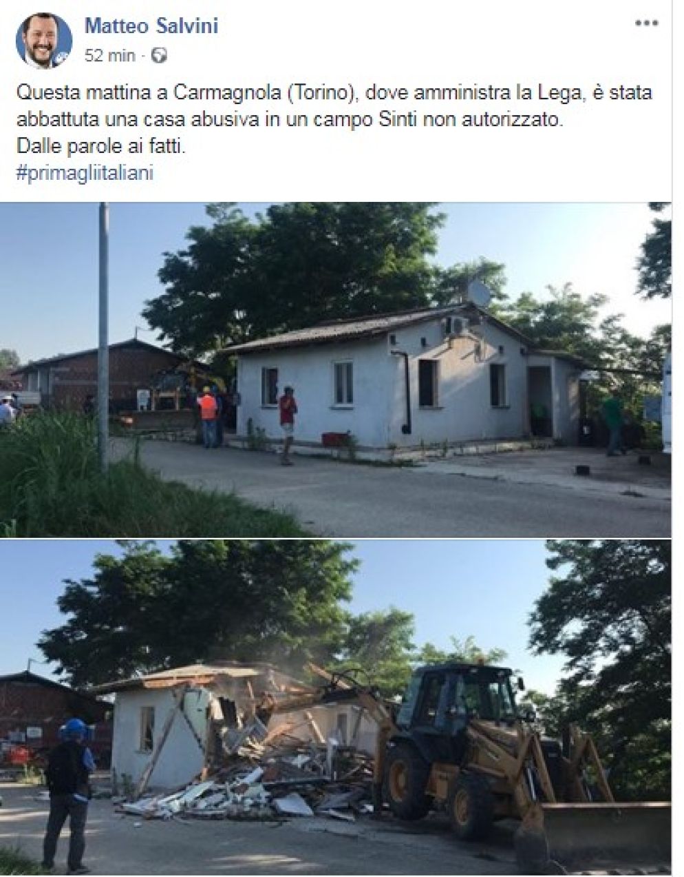 Non solo: nel suo profilo Salvini pubblica anche le foto dell'abbattimento di una casa abusiva in un campo Sinti non autorizzato.