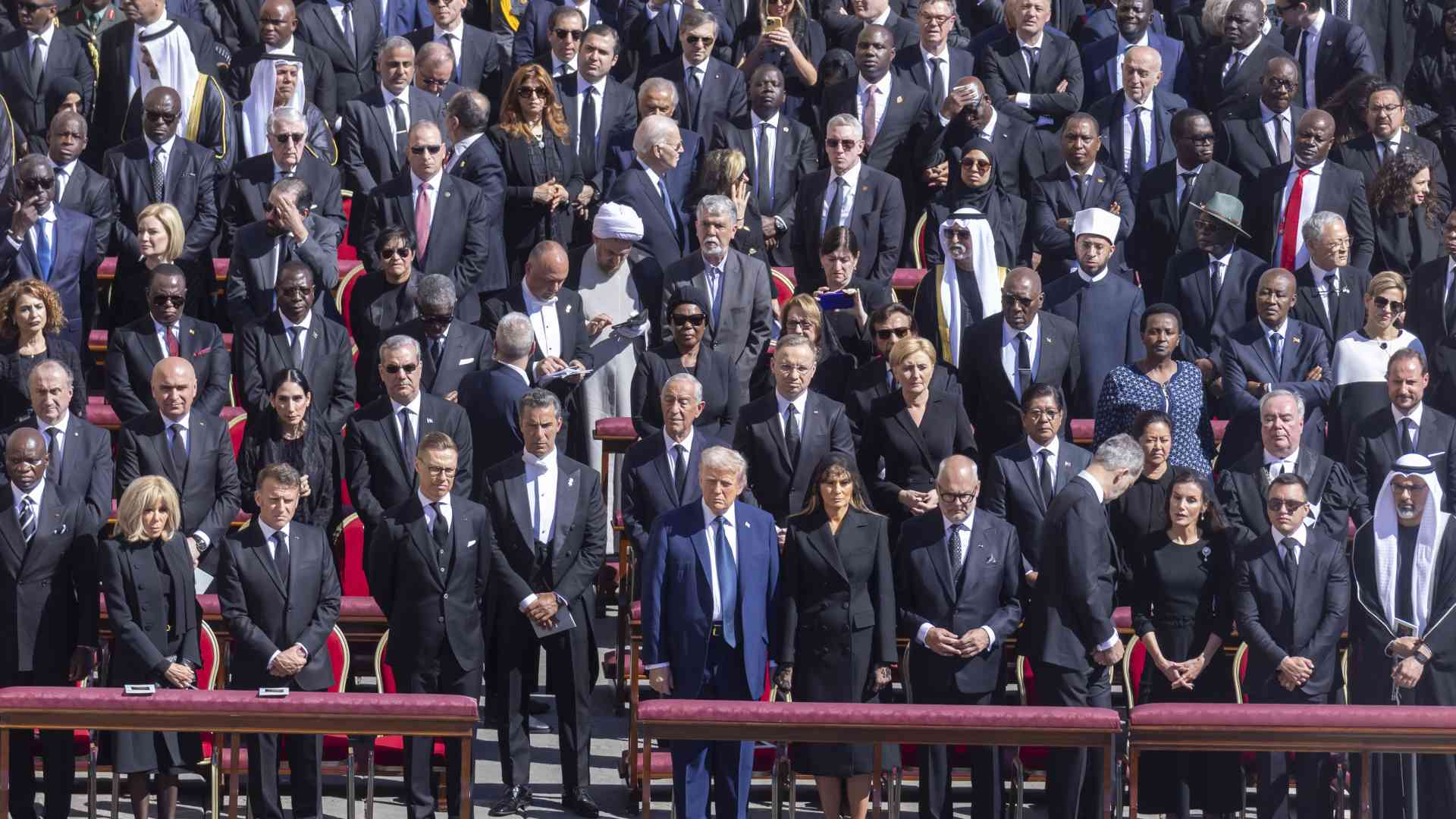 Passano i minuti e s’infittiscono gli arrivi delle delegazioni ufficiali (alla fine oltre 160), a comporre un mosaico nero che cromaticamente si contrappone come sempre al rosso porpora dei cardinali, sui lati opposti rispetto all’altare, quasi in una mappa del potere che contrappone quello temporale a quello spirituale della Chiesa. Ecco arrivare Ursula von der Leyen, presidente della Commissione Ue, venuta a omaggiare quel Papa che nel 2016 fu insignito anche del premio europeo Carlo Magno. Scocca l’ora dei reali: ecco Felipe di Spagna con la consorte Letizia, quindi il principe Alberto di Monaco con la moglie Charlene (la più rigorosa nel rispettare l’etichetta, con tanto di velo nero in testa), Abdullah II di Giordania accompagnato da Rania, Carlo Gustavo di Svezia con la regina Silvia, Filippo e Matilde sovrani del Belgio, fino ai principi ereditari William per il Regno Unito e Mette-Marit per la Norvegia. Spunta anche una figura con un vistoso copricapo da nativi americani.