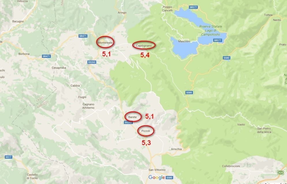 La scossa di terremoto avvenuta alle ore 10.25 di oggi è stata di magnitudo 5.1 e ha avuto epicentro nella zona di L'Aquila, colpita dal terremoto nel 2009: secondo le prime stime dell'Istituto Nazionale di Geofisica e Vulcanologia (Ingv), è avvenuta a una profondità di 9 chilometri, ha avuto epicentro a Montereale (Aq). In Abruzzo è stata sentita in maniera particolarmente netta nel capoluogo di regione ed a Teramo, oltre che sulla costa. Numerose le segnalazioni anche dal Molise, da Termoli, in provincia di Campobasso, a Isernia. Le scosse successive, di magnitudo 5,4 e 5,3, hanno avuto come epicentro Capitignano e Pizzoli, sempre in provincia dell'Aquila.
