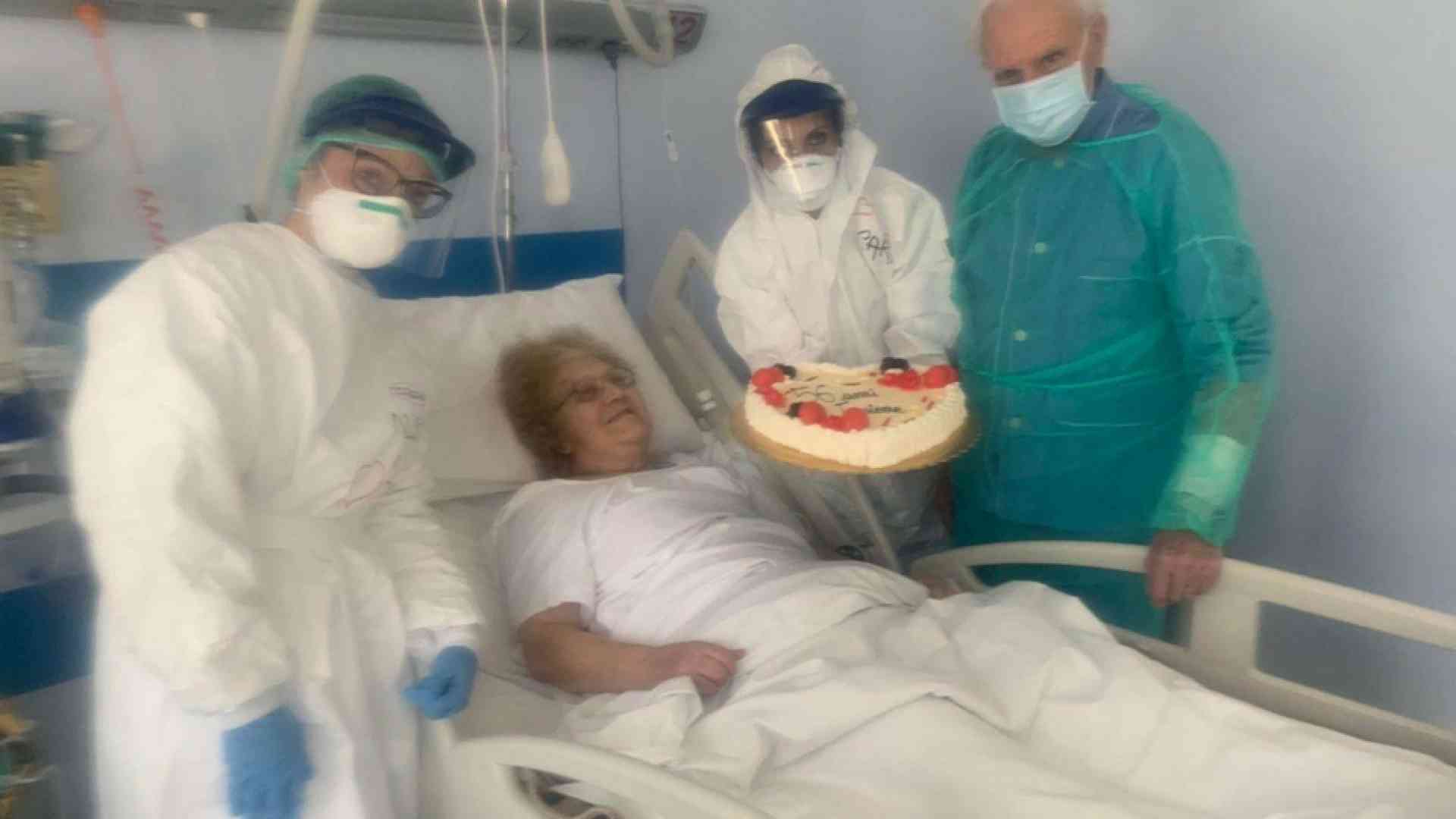 Umberto e Maria si sono rincontrati così, dopo settimane di malattia, stamane. Le mani nelle mani, gli occhi pieni di lacrime. Lei era stata ricoverata per prima, il 14 marzo scorso: dopo giorni difficili ora si è ripresa, anche se è ancora a letto e ha il volto provato. Lui invece è arrivato in ospedale il primo di aprile, sta già meglio per fortuna. "Buon anniversario" hanno iniziato a gridare tutti nella stanza, mentre una dottoressa ricoperta da tuta e protezioni ha mostrato alla coppia la torta.