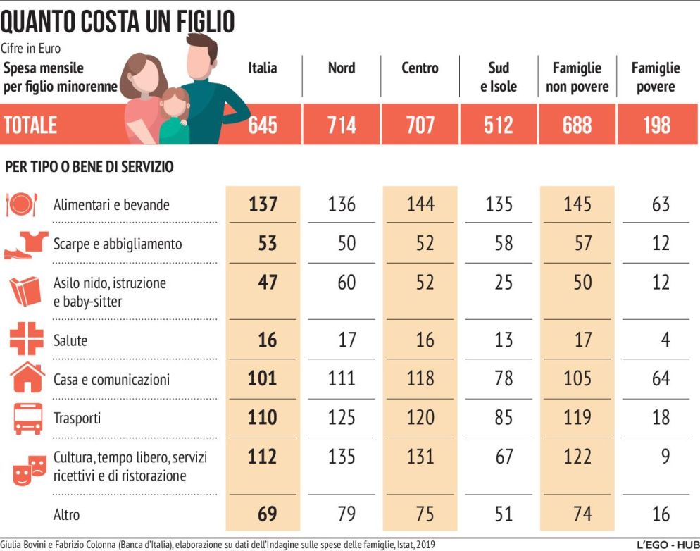 Mantenere un figlio costa in media 645 euro al mese in Italia. Al Nord la spesa è di 714 euro, mentre al Sud, dove il costo della vita è inferiore, si scende a 512 euro. Utilizzando un altro criterio di calcolo, che guarda a quanto dovrebbe spendere ogni mese una famiglia per mantenere inalterato il proprio livello di "benessere", si scopre che ciascun minorenne richiede in media 720 euro al mese, o che alle famiglie non povere servirebbero 763 euro a figlio, e 510 a quelle in povertà assoluta.