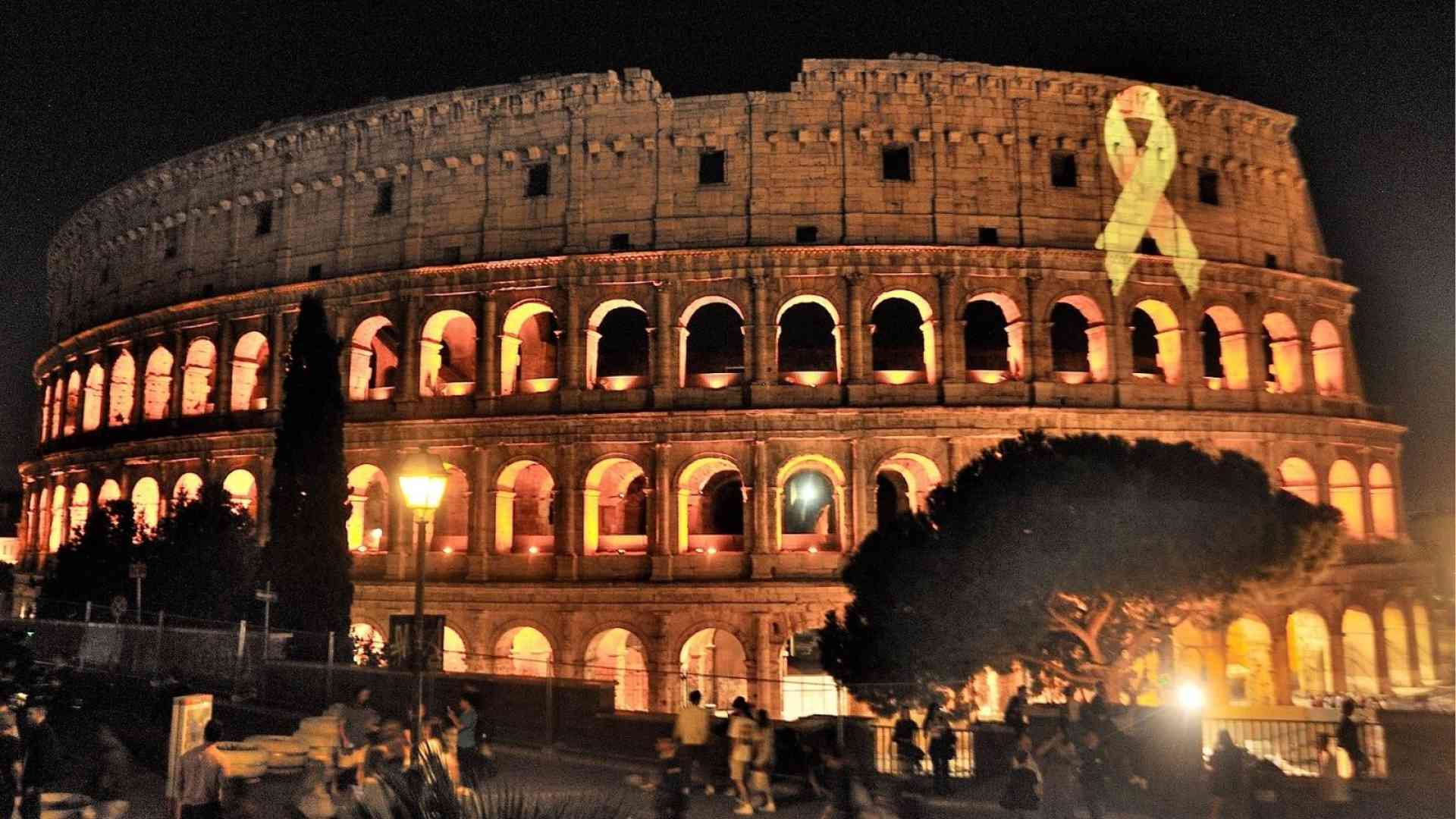Un nastro dorato proiettato sul Colosseo per portare un messaggio di speranza a tutti i bambini malati di cancro e per sostenere le loro famiglie. È l’iniziativa promossa da Peter Pan odv – organizzazione di volontariato che accoglie i piccoli malati di cancro in cura negli ospedali romani e le loro famiglie – per celebrare il "Settembre d’Oro", il mese dedicato alla sensibilizzazione sui problemi e i diritti dei bambini e degli adolescenti con tumori e sull’impatto della malattia sulle famiglie. In Italia, ogni anno, si ammalano 2.200 bambini e adolescenti. Per fortuna il 70% guarisce, ma il 19,5% deve recarsi in regioni diverse dalla propria per curarsi.