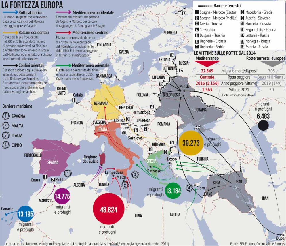 Non sarà facile, quando toccherà agli storici, spiegare che l’epoca dei muri non è più solo quella del Vallo di Adriano o il tempo del cinese Qin Shi Huang, l’imperatore padre della Grande Muraglia. Epoche in cui le fortificazioni servivano a proteggersi dalle incursioni armate. Non nel 2021, quando miliardi di euro vengono investiti per respingere nient’altro che persone disarmate.