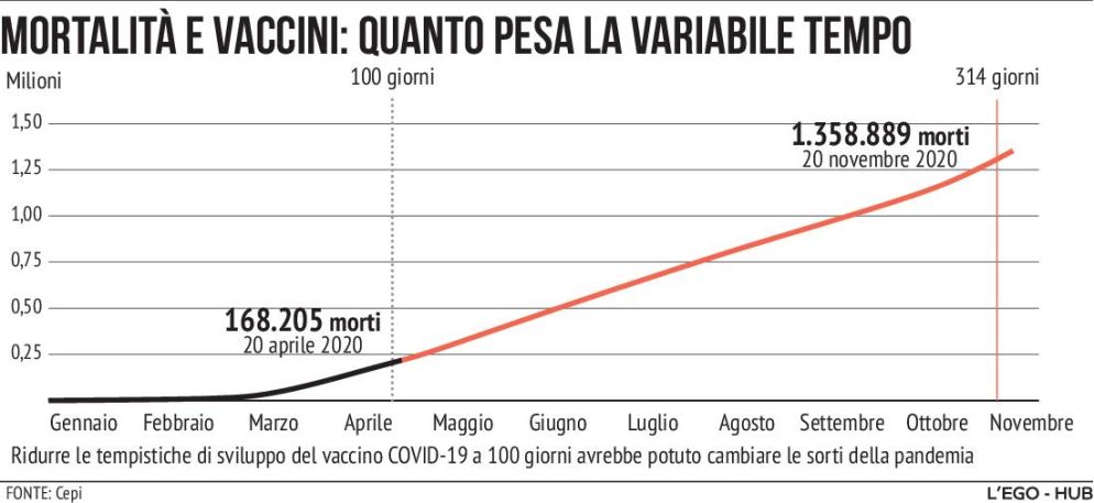 Dal sequenziamento genetico del virus Sars-CoV-2 alla presentazione dei dati degli studi clinici di fase 3 del primo candidato vaccino, sono trascorsi 314 giorni. Un tempo record: solo 10,2 mesi sono occorsi a Pfizer-BioNTech per sviluppare il vaccino a mRna. Tuttavia, all’epoca, il 20 novembre 2020, la pandemia aveva già causato nel mondo 1,35 milioni di morti. Che cosa sarebbe accaduto se la revisione degli studi da parte degli enti regolatori fosse avvenuta con 7 mesi di anticipo? Che cosa sarebbe successo, cioè, se anziché avviare le iniezioni l’8 dicembre 2020 – quando erano stati confermati 67 milioni di casi di contagio – la campagna vaccinale fosse partita l’8 maggio 2020, quando erano stati registrati meno di 3,8 milioni di casi? Gran parte di quei decessi si sarebbero potuti evitare. E i sistemi economici avrebbero risparmiato trilioni di dollari di danni. E conseguenze che si faranno sentire per generazioni.