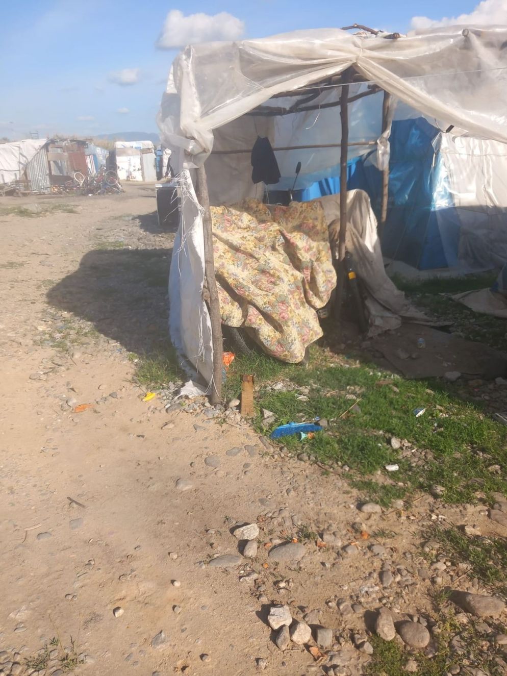 Dietro a noi i dieci container con bagni e docce, anzi quello che ne resta. Tutti rotti e nessuno interviene, uno scaricabarile tra istituzioni. Così per farsi una doccia dopo una giornata di lavoro sui campi è tornato il “mercato” dell’acqua calda, barili scaldati su fuoco a legna. A pagamento, 50 centesimi a doccia. Come nella vecchia baraccopoli. Continua la fila per ritirare i polli e le buste di cibo di Bartolo. Non c’è ressa. Diamo una mano nella consegna e scambiamo qualche informazione. Così scopriamo che gli immigrati presenti non sono 200, come ci era stato detto, ma molti di più, almeno il doppio. Sono ben visibili girando tra le baracche che ormai occupano tutti gli spazi liberi, anche le vie di fuga, rendendo la situazione ad alto rischio. Pochi giorni fa Joseph, del Sudan, da 13 anni in Italia, maneggiando dei cavi elettrici ha provocato una fiammata che gli ha ustionato parte del volto. Per fortuna non ha preso fuoco la baracca, altrimenti sarebbe stato un disastro. Ora ha ripreso il lavoro, prepara in serra piantine di pomodoro e peperoncino da trapiantare poi in campo aperto. Lavoro molto diffuso ma anche a rischio. Molti fanno vedere a Bartolo mani e braccia colpite da malattie della pelle, forse per l’esposizione ai pesticidi molto utilizzati, e non sempre rispettando le regole, nelle colture in serra. Ma c’è chi sta peggio.
