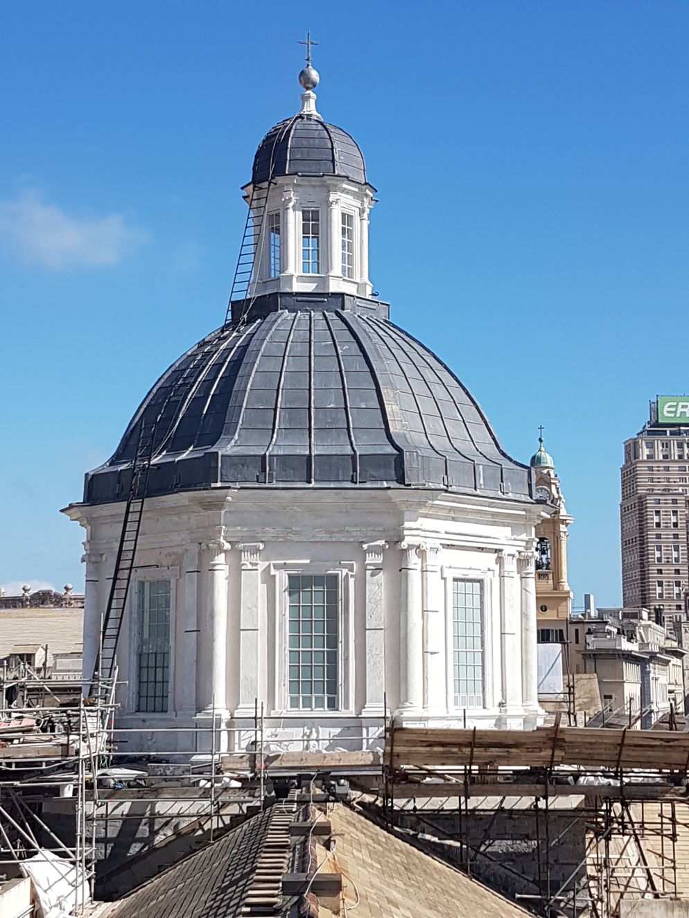Il restauro è durato quasi tre anni ed è stato finanziato per la maggior parte dalla Compagnia di San Paolo oltre a diversi altri benefattori. I lavori, infatti, sono iniziati nell’agosto 2015 e sono terminati nel marzo 2018. Quanto eseguito – spiega la diocesi in un comunicato – ha consentito di studiare la cupola del Duomo come mai è stato possibile sino ad oggi. Non solo la fase costruttiva presieduta dall’architetto perugino Galeazzo Alessi, ma anche il periodo successivo, sino ad arrivare ai giorni nostri, periodo in cui la cupola ha subito mutamenti e modifiche di ogni specie, che ne hanno cambiato la conformazione architettonica e il suo skyline, alterando le linee che Alessi aveva tracciato nel suo progetto realizzato tra il 1556 e il 1567. Il mutamento della cupola ha inizio con il bombardamento francese del XIV secolo, quando Luigi XIV tentò invano di sottomettere Genova. I danni causati dalle bombe scagliate dalle imbarcazioni francesi furono notevoli, tanto che alla metà del XVIII secolo furono necessari imponenti lavori per consolidare la cupola. Altri interventi importanti furono eseguiti nel 1820 dall’architetto civico Carlo Barabino e nel 1843 dal suo successore Giovanni Battista Resasco.