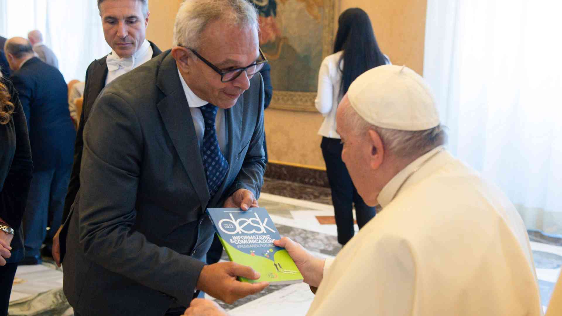 La prima copia è stata donata al Papa da un comprensibilmente emozionato Vincenzo Varagona. Durante l’udienza in Vaticano per i 25 anni del Copercom, il coordinamento tra l’associazionismo cattolico che si occupa di comunicazione, Francesco ha ricevuto dal presidente nazionale Ucsi (e storica firma di Avvenire) il numero speciale della rivista associativa «Desk» che raccoglie 40 brevi saggi di altrettanti nomi del giornalismo cattolico italiano con le loro riflessioni sul futuro della professione, un’«iniziativa nata da un laboratorio in presenza il 14 maggio 2022 nella sede Ucsi di via in Lucina a Roma.