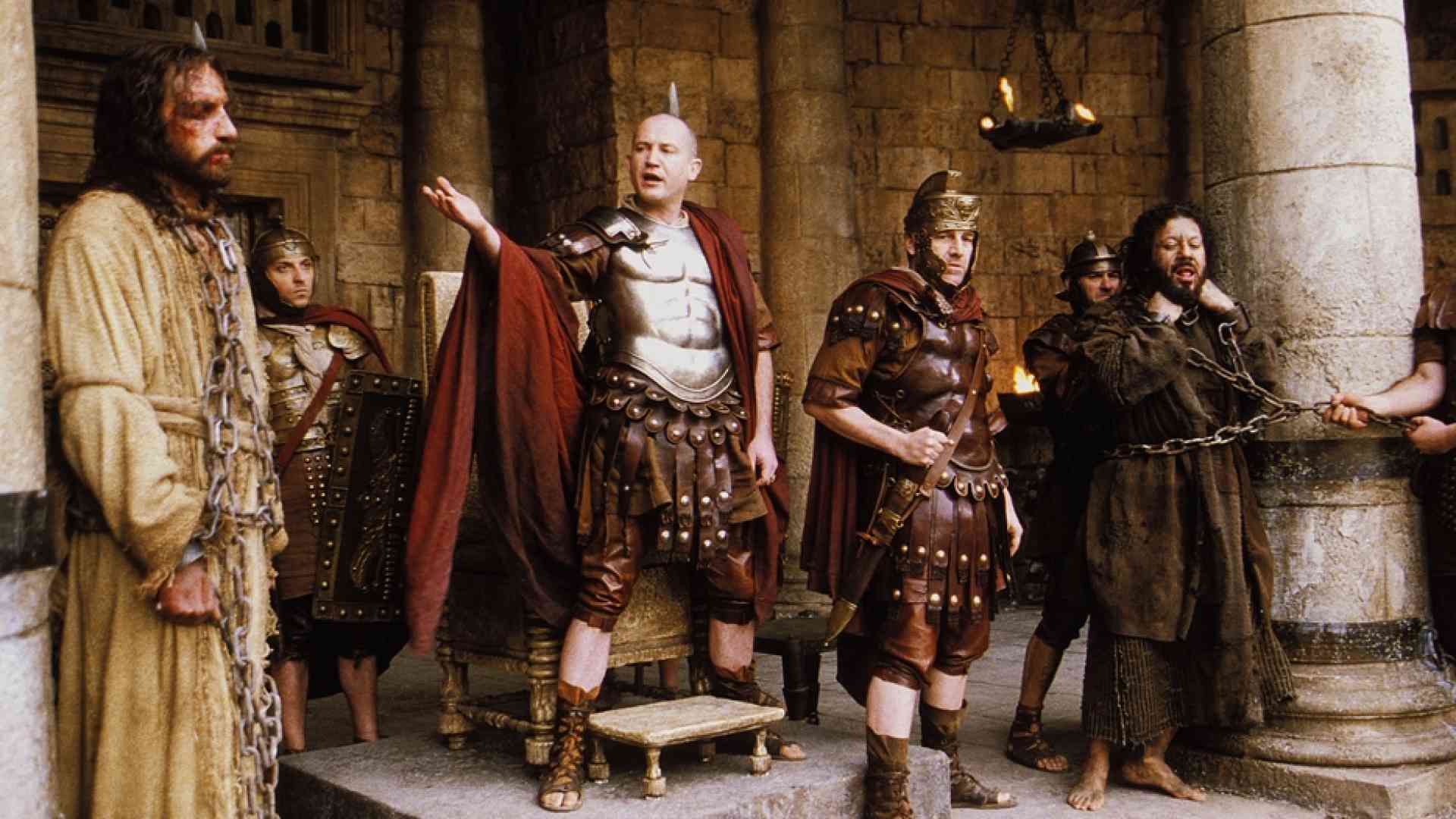 PHILIPPE ANTONELLO/ANSA/PAT | Ponzio Pilato (Hristo Naumov Shopov) al centro chiede al popolo di scegliere chi dei prigioneri debba essere liberato: Gesu''( Jim Caviezel) (s) o Barabba (Pedro Sarubbi) (d) in una foto di scena del film