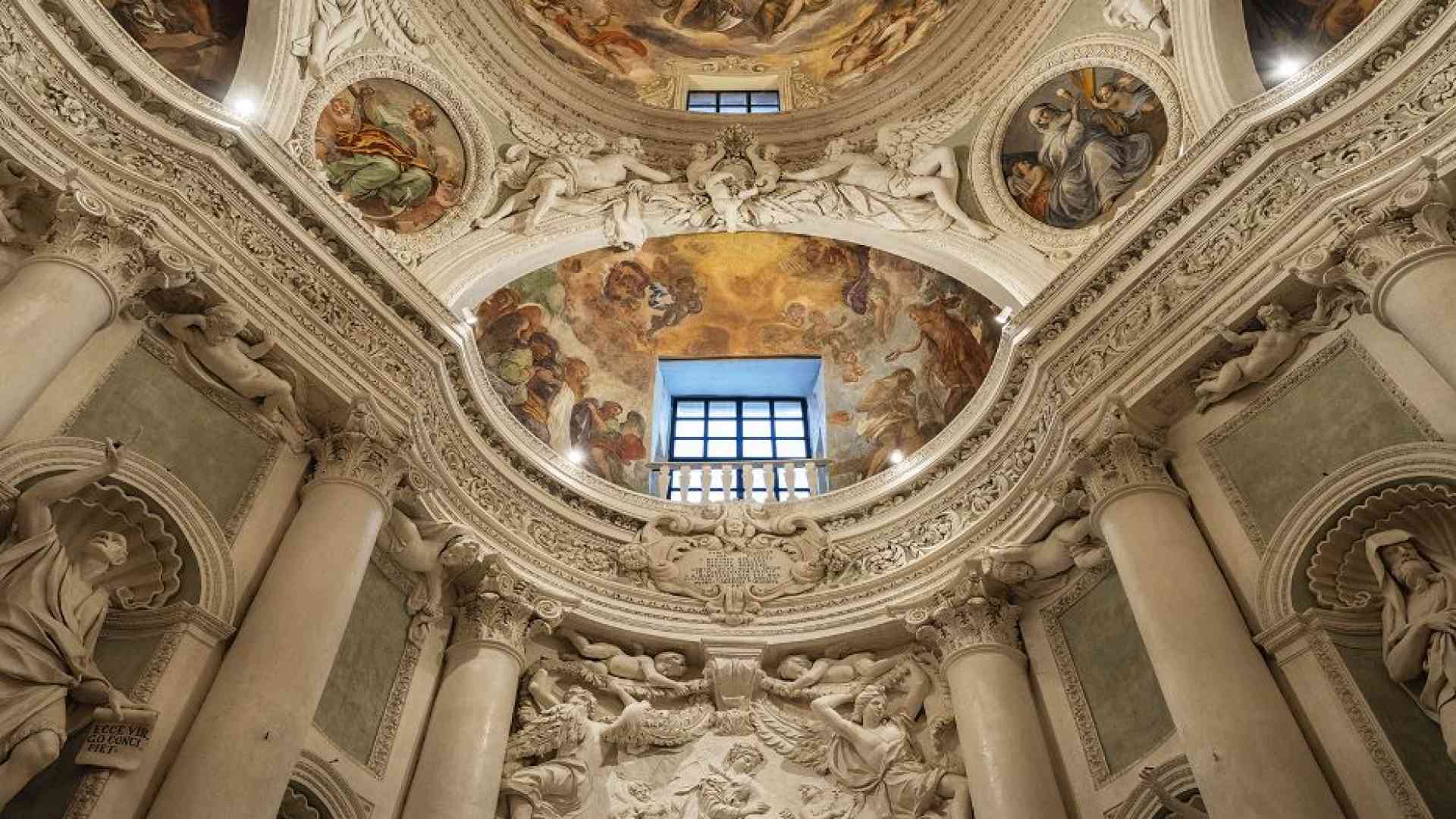 Siamo a Gubbio, la città di pietra, il cui dedalo di strade spande a destra e a manca esempi di arte medioevale. Prima di avventurarcisi varcando le porte dell’antico borgo, però, sulla soglia a metà tra la città e la campagna, sorge la chiesa della Madonna del Prato, la cui sobria facciata di pietra locale palombina nasconde al visitatore una ricca decorazione interna e una cupola affrescata: una goccia di Barocco resa unica tanto per lo stile delle decorazioni, inconsuete in questa zona, quanto per la notorietà degli artisti che vi lavorarono, tra cui spicca la firma di Francesco Castelli detto il Borromini.