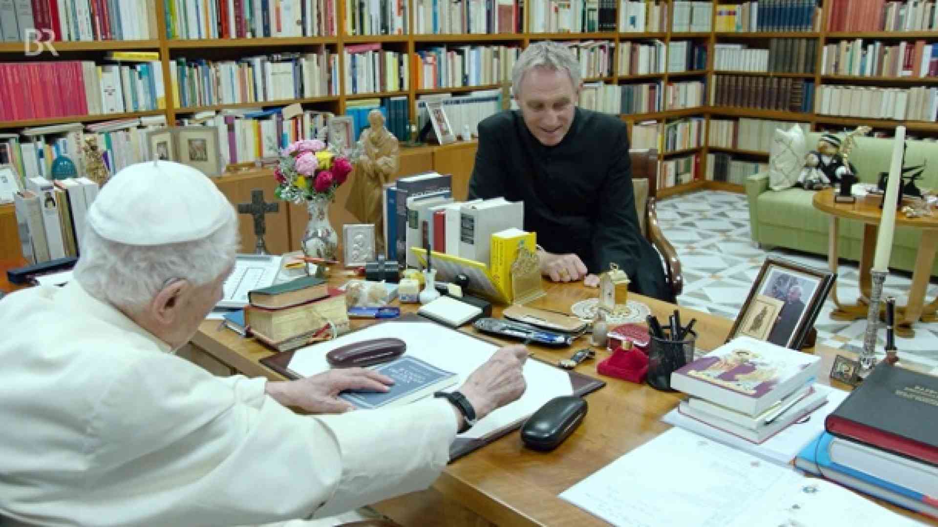 La giornata di Benedetto è segnata da un rigido programma. Alle 7.30 ha il primo appuntamento nella cappella del piccolo monastero che occupa, dove celebra la messa con Gaenswein e le donne consacrate che si occupano della casa. La giornata la passa molto tempo in ufficio, circondato da libri che "sembrano una biblioteca", dice Forchheimer. "La vita del professore di teologia Joseph Ratzinger si riflette in migliaia di libri; dice che per lui tutte le fasi della sua vita sono contenute nei libri e si occupa di loro ogni giorno", rileva l'autore.