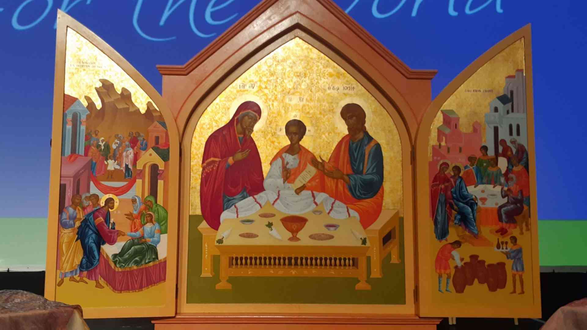 Tra le immagini simbolo del nono Incontro Mondiale delle Famiglie in corso a Dublino è la grande icona dorata che rappresenta proprio la Sacra Famiglia, con Maria e Giuseppe seduti ai due lati di un Gesù adolescente ma già autorevole e centrale rispetto ai genitori, ritratti in atteggiamento di devozione.