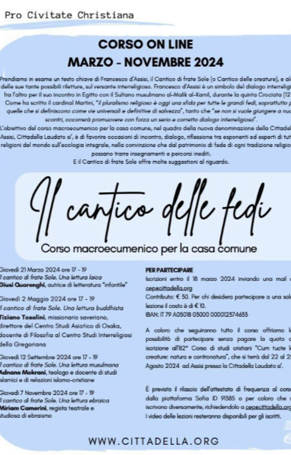 Per capire bene il senso dell’iniziativa, bisogna partire dal luogo che la ospita. Ovvero la Cittadella di Assisi, nella sua nuova denominazione di Cittadella Laudato si’, a rimarcare l’importanza dell’enciclica di papa Bergoglio, nella terra e alla scuola di san Francesco. Qui, nella sede della Pro Civitate Christiana si inaugura giovedì 21 marzo l’itinerario online “Il Cantico delle fede” definito “corso macroecumenico per la casa comune”.