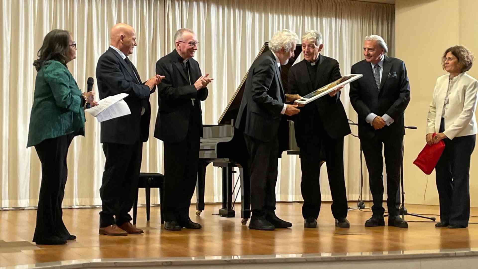 Il musicista premio Oscar ha ricevuto il riconoscimento a Villa Nazareth. Presenti tra gli altri i cardinali Pietro Parolin e Edoardo Menichelli.