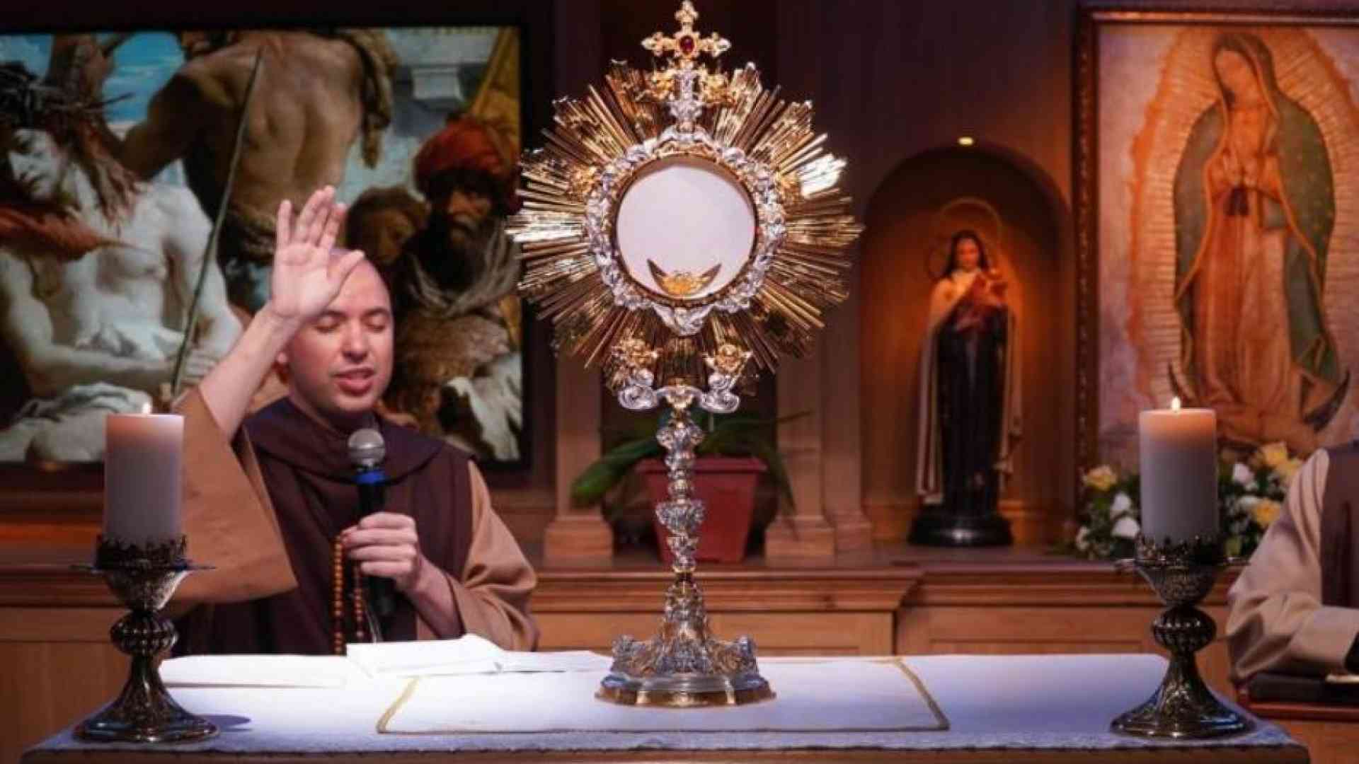 La telecamera inquadra l’Eucaristia nell’ostensorio, in primo piano, mentre una voce recita l’atto di adorazione alla Santissima Trinità e la supplica ai santi angeli, in particolare agli arcangeli Michele, Gabriele e Raffaele. Sette minuti di invocazioni al termine dei quali l’inquadratura si allarga ed entra nel campo visivo un religioso, abito color caffè e testa rasata, che passa a enumerare le intenzioni di preghiera: per il Papa, per i vescovi, per la santificazione del clero e via di seguito allargandosi alla situazione del Brasile e del mondo, per altri sette minuti. Fino all’incipit del Rosario: « Avé Maria, cheia de graça, o Senhor é convosco, bendita sois vós entre as mulheres e bendito é o fruto do vosso ventre, Jesus…».