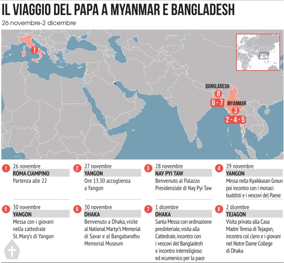 Papa Francesco arriva oggi in Bangladesh, terza visita in terra bengalese di un Pontefice, la prima da quando 31 anni fa il Paese ha cambiato in buona parte la sua fisionomia. Un evento da lungo tempo pianificato e preparato che si confronta ora inevitabilmente anche con la crisi dei Rohingya, la minoranza in fuga dal confinante Myanmar che va ad affollare i campi profughi in aree già problematiche del Paese. Che si situa anche nella realtà in grande maggioranza musulmana di 170 milioni di abitanti su un territorio limitato, con enormi problemi di sviluppo e, minori ma presenti, di convivenza.