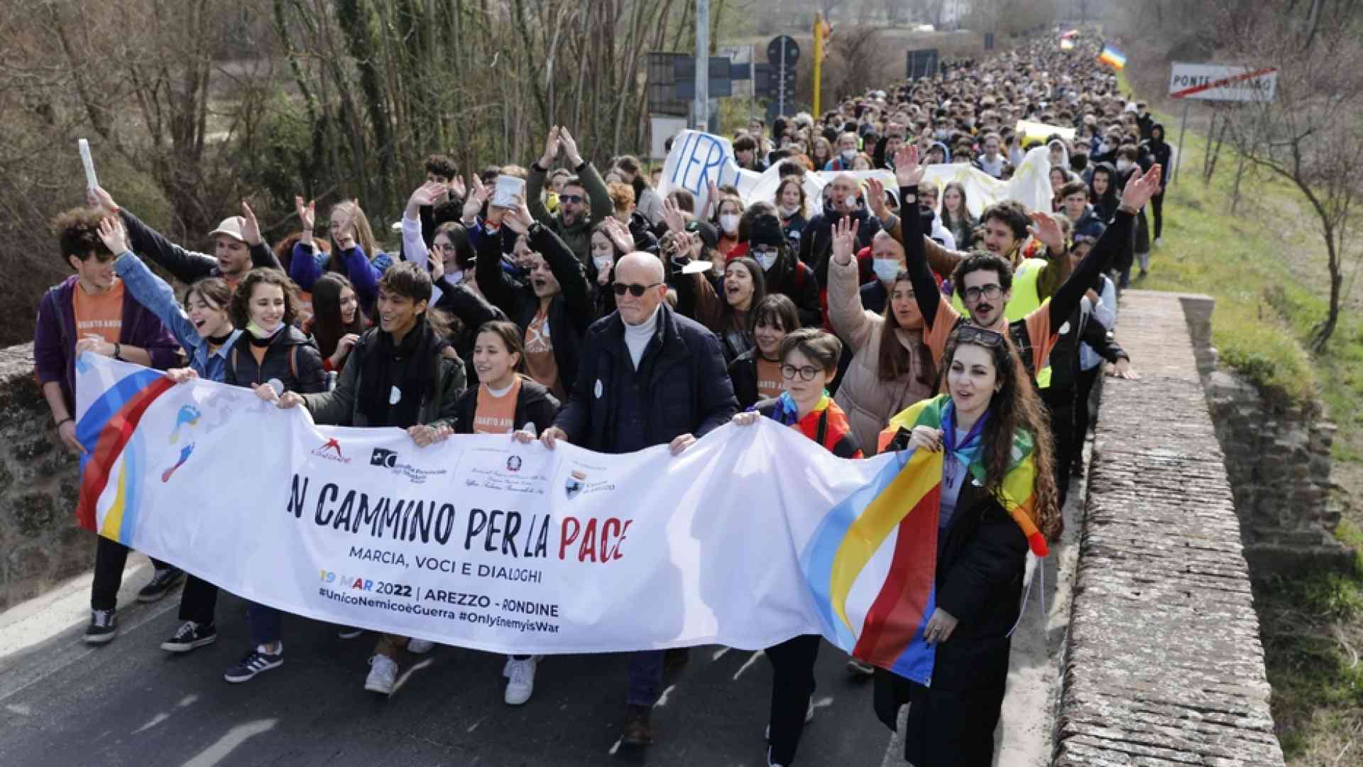 La sua testimonianza è una di quelle che conclude la marcia della fraternità dove le bandiere di Russia e Ucraina si annodano insieme. In quattromila sfilano lungo i dieci chilometri che da Arezzo portano alla Cittadella della pace per l’iniziativa “Rondine, in cammino per la pace”. Sono soprattutto ragazzi delle scuole. Ma a fianco hanno anche i propri docenti e tanti cittadini che hanno risposto all’appello di Rondine. Insieme con loro – seppur in collegamento telefonico – la senatrice a vita Liliana Segre. Ai «carissimi ragazzi» si rivolge come «chi ha visto la guerra e sa tutti i pericoli che tutti noi corriamo quando c’è qualcuno che perde di vista l’umanità e decide di distruggere e non costruire». Poi chiede di «non restare indifferenti». A portare un messaggio di riconciliazione anche Anna Safroncik, attrice nata a Kiev e naturalizzata italiana, che nel suo videointervento definisce la guerra «una pazzia» ed esorta a «dimostrare che l’unione, la fratellanza e la solidarietà possono vincere su tutto».