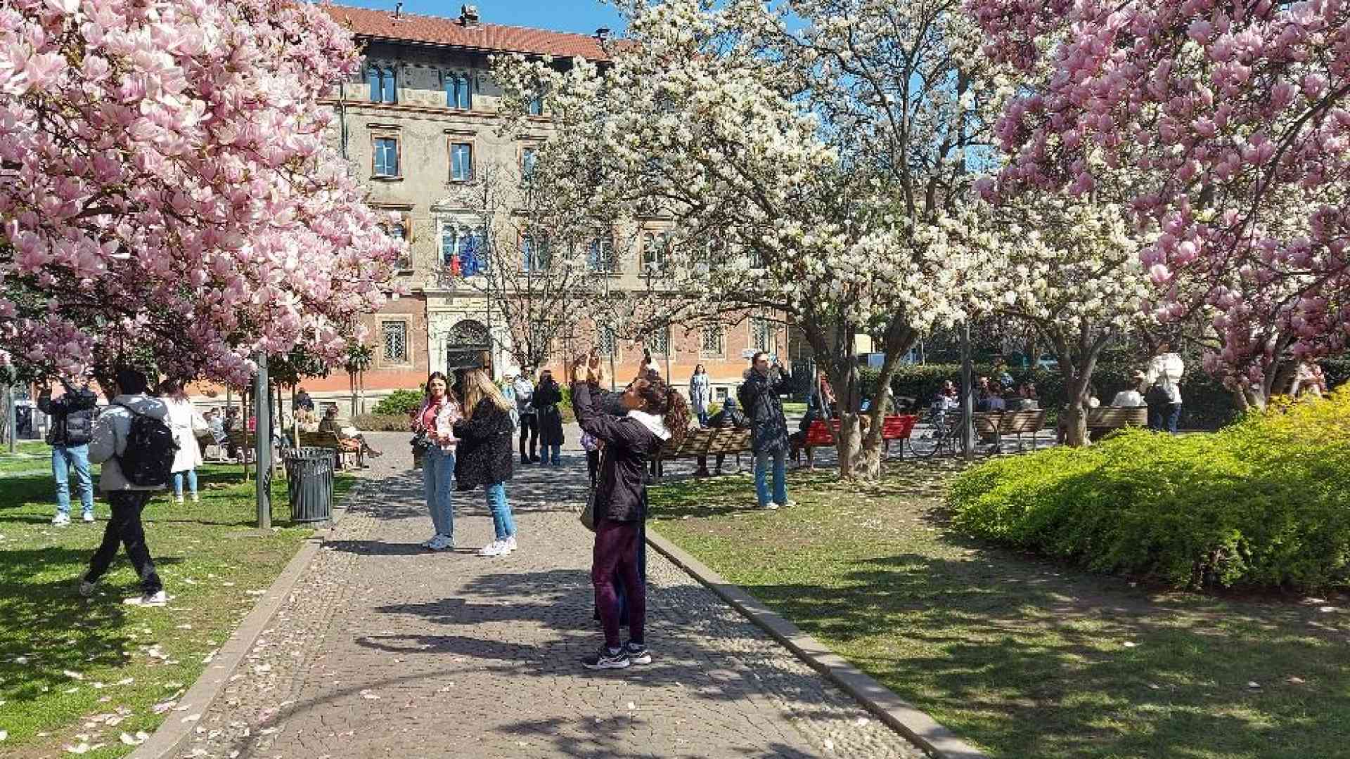Tra la scuola delle Marcelline e la parrocchia di Santa Maria Segreta – due dei luoghi dov’è cresciuto – il giardino con le magnolie dà spettacolo e attira foto e selfie di giovani e turisti