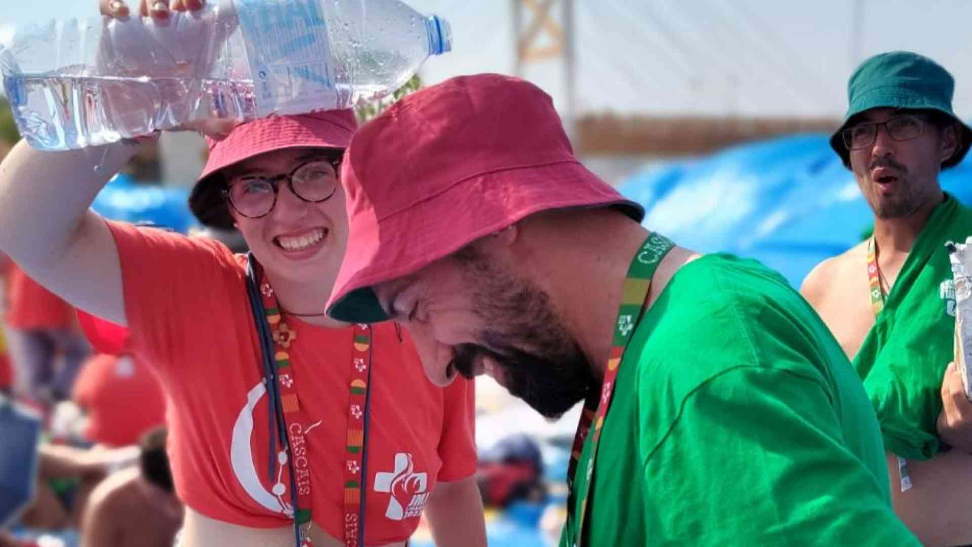 Per fortuna il conto alla rovescia delle fermate arriva alla fine. «Lisbona Orient, si scende! Stiamo uniti!». I gruppi crescono minuto dopo minuto a vista d’occhio, però in stazione si riesce a uscire velocemente. Inizia il cammino sotto il sole. Dopo pochi minuti i giovani trovano subito il rifornimento dei pasti. Tra lo stupore di tutti trovano pochi secondi di fila e... via. Sacchetto pieno. Gli educatori indicano di fermarsi poco dopo in un viale alberato. Sosta tecnica per prendere energia.