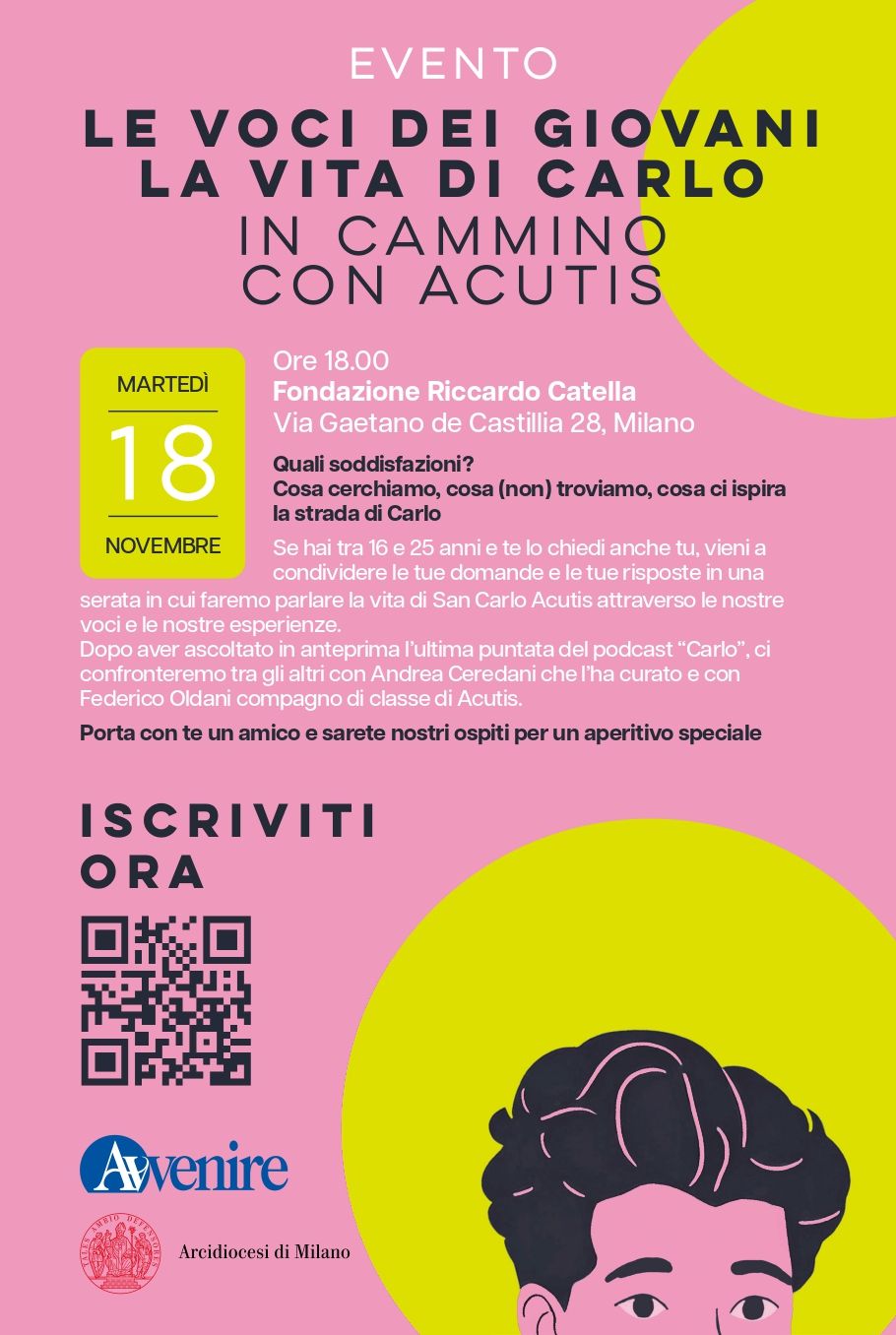 Tutte le testimonianze dei giovani che si sono fatti interrogare dalla vita di Carlo Acutis saranno raccolte nella quinta puntata del podcast di Avvenire, realizzato con la collaborazione della diocesi di Milano, "Carlo. Sui passi di Acutis". La puntata sarà ascoltata in anteprima il prossimo 18 novembre a Milano, a partire dalle 18, nell'ambito dell'evento "Le voci dei giovani, la vita di Carlo. In cammino con Acutis". Tra gli ospiti con cui la platea potrà dialogare, oltre ai giornalisti che hanno realizzato il podcast, sarà presente anche Federico Oldani, amico di Carlo. Per iscriversi, basta accedere al portale dedicato e inserire i propri dati anagrafici.
